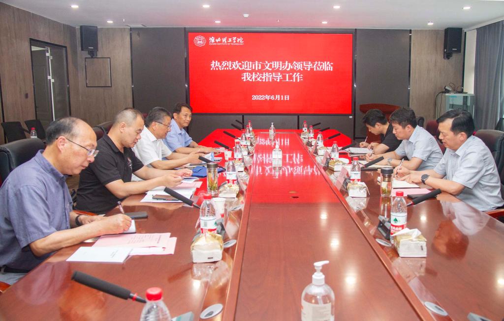 6月1日下午,淮北市文明办副主任李峰、淮北市文明创建督导中心主任王新宇、淮北市文明创建督导中心督查科长邢建国一行到beat365官网开展文明校园创建的调研工作。校党委书记、督导专员朱德顺、副校长郑来纪、党建办公室主任付金沐、学生处处长孙增响出席座谈会。