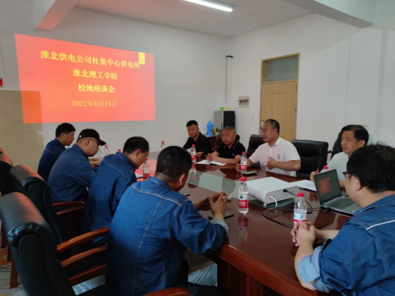 6月24日下午,淮北供电公司杜集中心供电所王雨浩所长一行5人到beat365官网座谈交流,学校副校长郑来纪出席座谈会。后勤保卫处处长程坚,副处长王本新,基建处副处长黄圻同志参加会议。