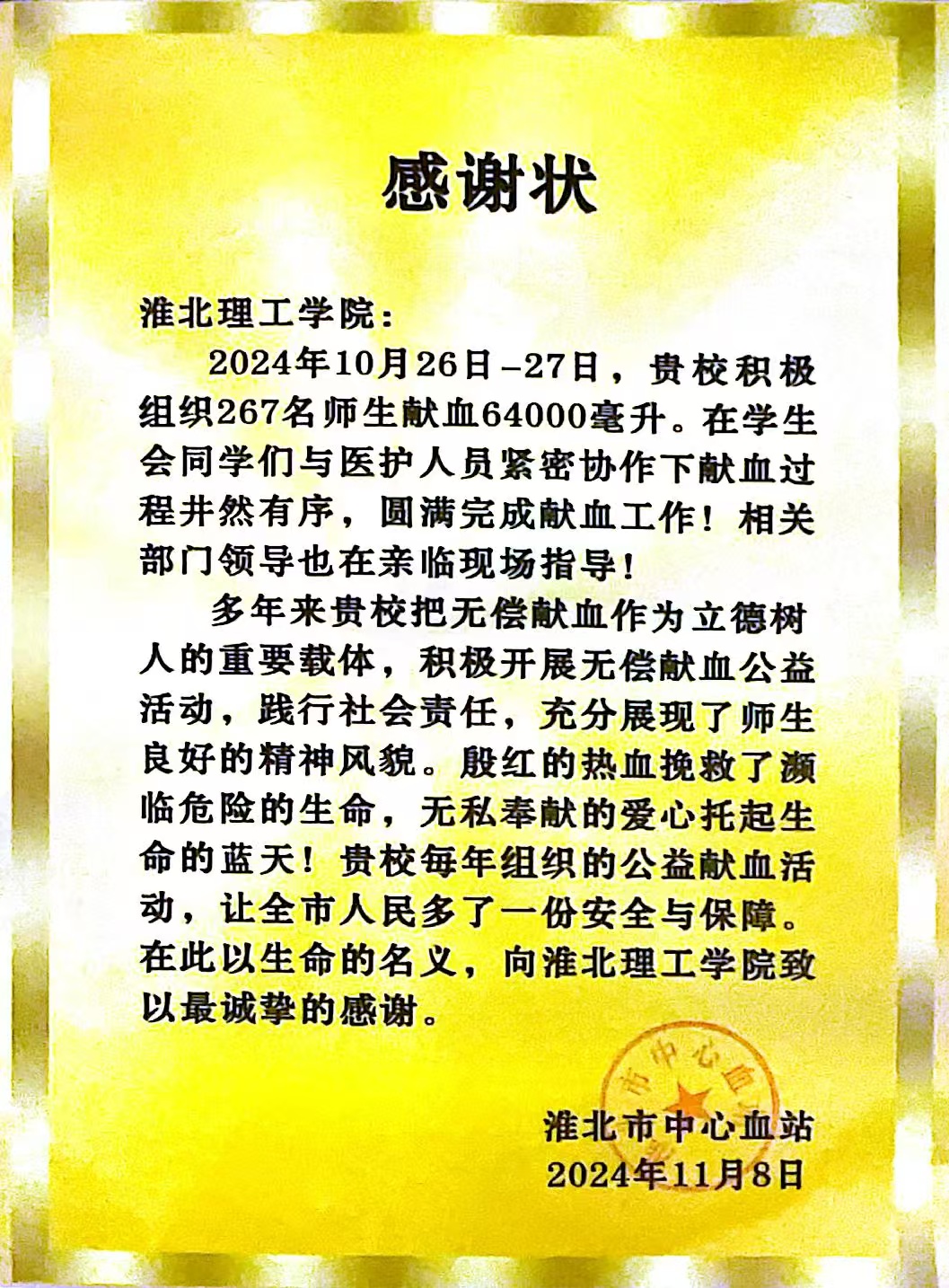 近日,beat365英国官方网站收到淮北市中心血站“感谢状”,感谢学校一直以来积极组织师生参与无偿献血,用热血共筑生命希望,奉献爱心,为社会播种温暖力量。