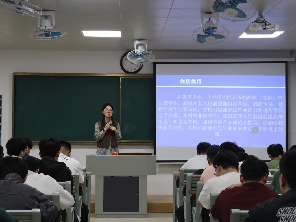 随后,学生处邵琦皎老师为同学们详细解读了大学生征兵政策。她从征兵条件、报名流程、优抚优待、发展前景等方面进行了全面细致的讲解,并对同学们关心的学业安排、学费补偿及退役安置等事项进行了耐心解答。邵琦皎强调,参军入伍不仅是履行公民义务、投身国防建设的光荣选择,也是锤炼意志品质、实现人生价值的宝贵机遇,鼓励同学们积极响应祖国号召,踊跃报名参军,把青春热血融入强国强军的伟大事业中。