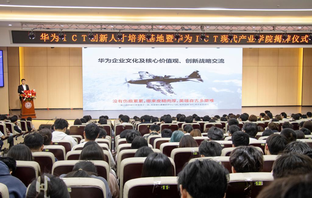 揭牌仪式结束后,与会嘉宾一同前往参观beat365英国官方网站-华为ICT现代产业学院,实地了解学院的教学设施、实训环境和建设成果。李雨涛为参会学生作了《突破边界,智启未来——华为技术创新与卓越工程师使命》主题报告,在报告中,李雨涛结合华为前沿技术案例,深入剖析了ICT行业发展趋势,阐述了卓越工程师在技术创新中的重要使命,为在场师生带来了一场精彩的知识分享。