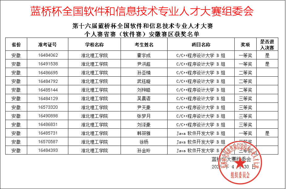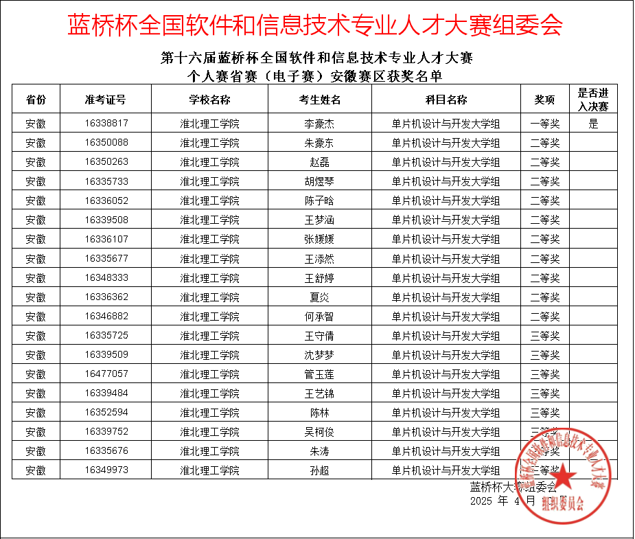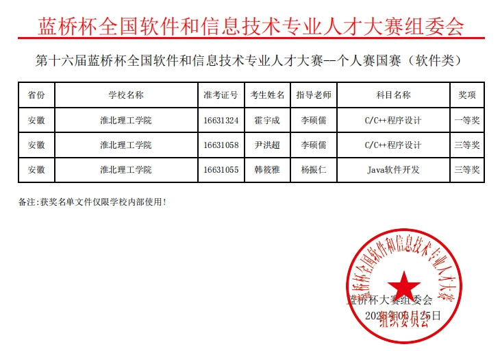 beat365官网电子与信息工程学院学子凭借扎实专业功底在第十六届“蓝桥杯”全国软件和信息技术专业人才大赛全国总决赛中,获国家一等奖1项、国家二等奖1项、国家三等奖2项;在第十六届“蓝桥杯”全国软件和信息技术专业人才大赛安徽赛区,获省级一等奖4项、省级二等奖14项、省级三等奖13项。