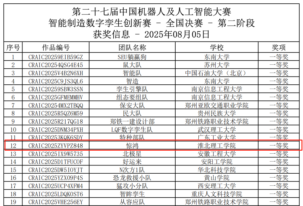 中国机器人及人工智能大赛是一项历史悠久、影响广泛的全国性学科竞赛,也是国内规模最大、影响力最强、专业水平最高的机器人竞赛之一,自1999年开赛以来已成功举办26届,现已列入中国高等教育学会发布的全国普通高等学校学科竞赛排行榜(84项)、全国普通高校大学生竞赛分析报告。获此国奖,体现学校长期以来注重学科竞赛与实践教学相结合、大力培养学生创新精神和实践能力的成果体现,检验了学校实践教学成果,更通过高水平竞技平台拓宽学生视野,为深化“新工科”教育改革积累经验。