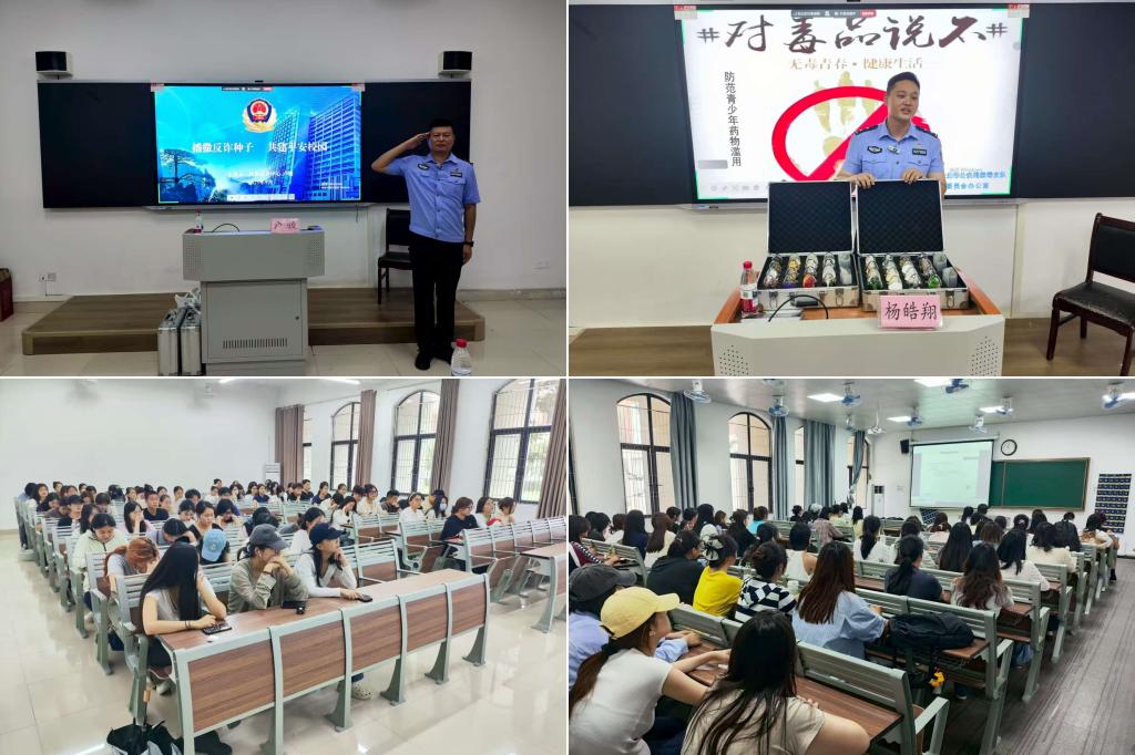 随后,杜集区公安局禁毒大队杨皓翔警官与刑警大队副队长卢骏警官分别围绕“人身财产安全”“网络安全”“禁毒宣传”等主题展开宣讲。卢警官结合近期高发的电信网络诈骗案例,深入剖析了刷单返利、虚假贷款、冒充客服等校园常见诈骗手段,提醒新生警惕“高佣金兼职”“紧急转账”等陷阱,围绕人身安全、网络安全等内容展开讲解,结合《反电信网络诈骗法》相关条款,强调法律对电信诈骗的严厉打击及公民的防范责任。结合真实案例,剖析了校园盗窃、网络诈骗、电信欺诈等常见安全隐患,传授了识别风险、保护隐私的方法,并呼吁新生树立法治观念。杨警官通过仿真毒品模型展示、涉毒案例视频播放等形式,系统讲解传统毒品(海洛因、冰毒)与新型合成毒品(邮票LSD、笑气)的危害,以“远离毒品,珍爱生命”为主题,用“案例+实物+互动”的形式,为新生们揭开了毒品的“伪装面具”,并结合《禁毒法》条款,解读容留他人吸毒、非法持有毒品等行为的法律责任,呼吁新生筑牢拒毒心理防线。