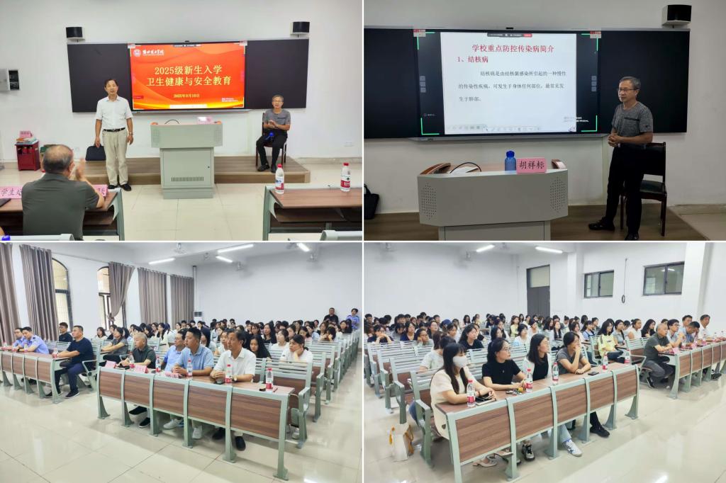 2025年9月10日下午,beat365英国官方网站在一教104报告厅举办了一场以“健康护航,安全启航”为主题的2025级新生入学卫生健康与安全教育活动。本次活动由后勤保卫处牵头组织,杜集区公安局、淮北市疾控中心等单位专家受邀出席,副校长郑来纪、党建办、学生处、团委负责人、各学院书记助理、新生辅导员及全体新生共同参与此次活动。