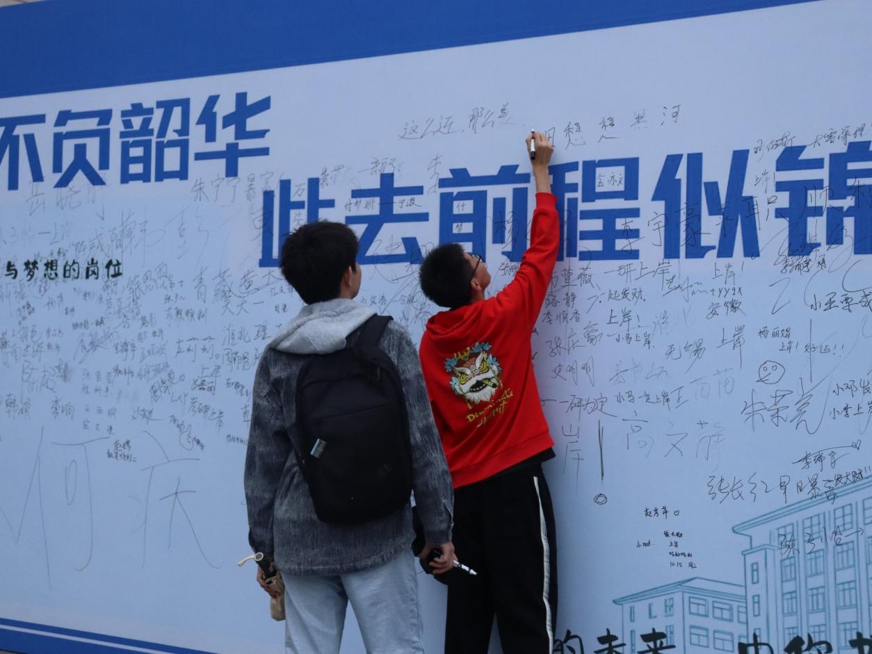 会场外,“青春不负韶华 此去前程似锦”主题签名墙吸引了众多学子驻足。大家纷纷执笔,留下签名与职业愿景,这面承载着青春梦想的蓝色签名墙寓意着从校园到职场的广阔未来,成为双选会一道充满温情的风景线。