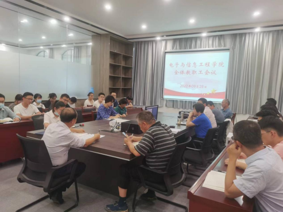 9月28日下午,电子与信息工程学院组织召开本学期第五周全体教职工工作会议。电子与信息工程学院全体教职工参会,会议由朱昌杰院长主持。针对近期学校及学院重点工作进行了安排和讨论。会议内容分为六部分,分别是: