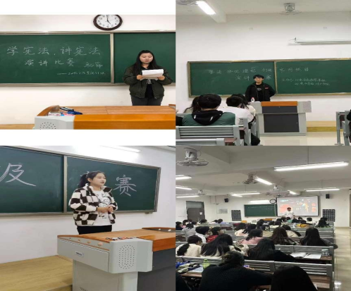 举行主题演讲比赛。十一月上旬组织开展以“学宪法、讲宪法”为核心的演讲比赛,比赛围绕“学宪法,讲宪法”的活动主题展开,比赛活动中,参赛选手们围绕“普法、修德、守纪”主题,鲜明、完整地表达了自己的见解。他们以思想、感情、事例和理论向我们阐明,要具备现实关切要求,关注“德法结合”的国家治理体系,关注“德法保障”的美好生活和“德法互彰”的伦理文化,确定“德法兼修”的价值需求,争做新时代守法明德新青年。整场比赛精彩纷呈、高潮迭起,引起现场观众共鸣,赢得阵阵掌声。