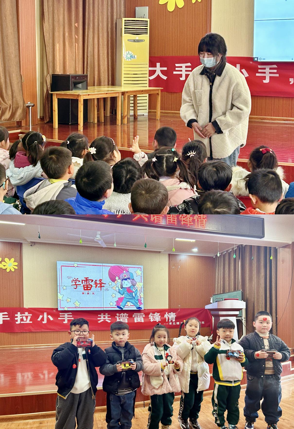 为进一步发扬雷锋精神,弘扬社会正能量,用榜样力量点燃新时代希望,传承红色基因,将雷锋精神与爱国情怀厚植于幼儿心中。教育学院于3月1日下午3点举办“大手拉小手,共谱雷锋情”走进幼儿园雷锋志愿活动。活动由学院辅导员郭鸿鑫、孙虎老师带领8名学前教育专业的学生前往淮北市商业局幼儿园开展活动。