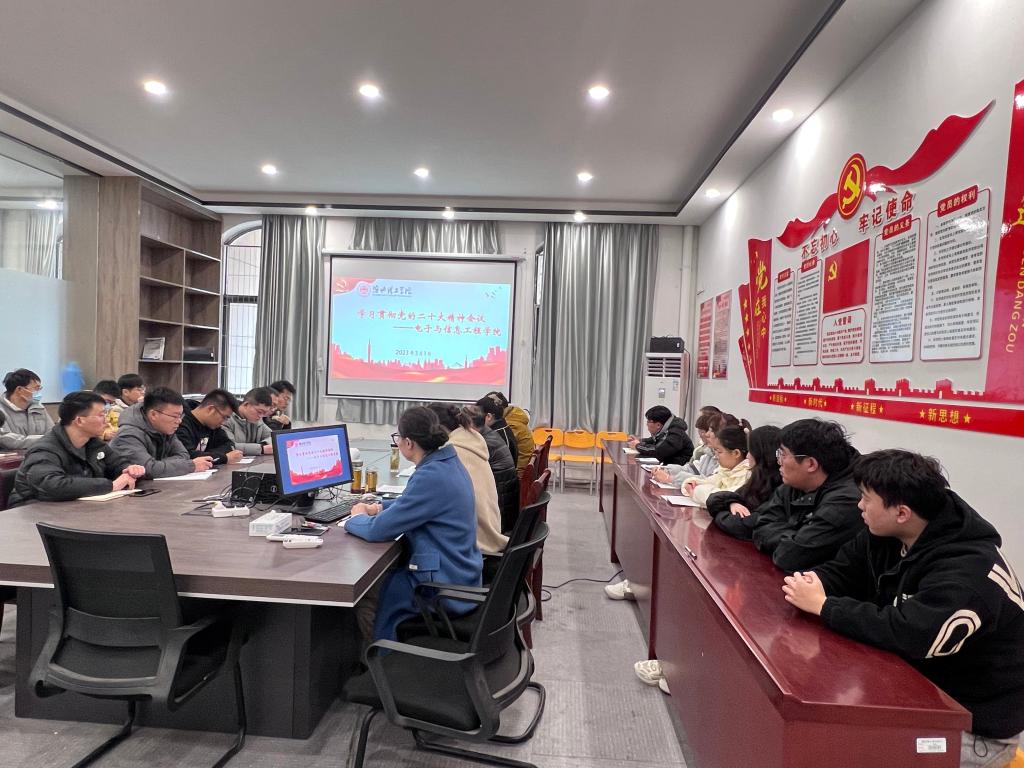 3月1日下午,电子与信息工程学院党总支在学校第二教学楼117会议室召开学习贯彻党的二十大精神会议。学院全体教工党员和在校的学生党员(含预备党员)参加会议,会议由学院党总支书记朱昌杰同志主持。