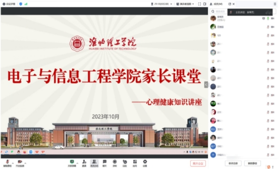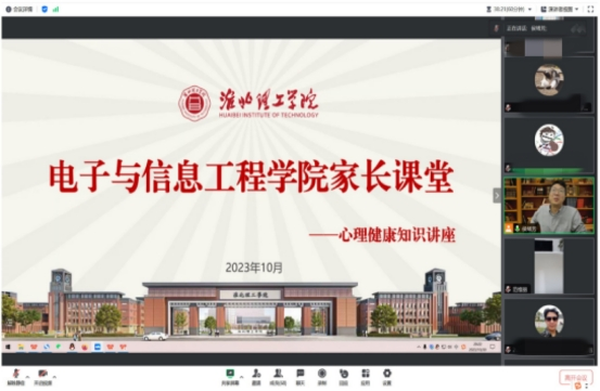 为全面推进素质教育,加强学生的心理健康教育,电子与信息工程学院于10月30日8点开展线上心理健康知识讲座活动。本次活动主讲人为电子与信息工程学院团总支书记侯绪芳老师,电子与信息工程学院学生家长参加了此次线上课堂。