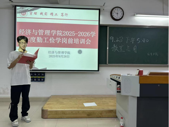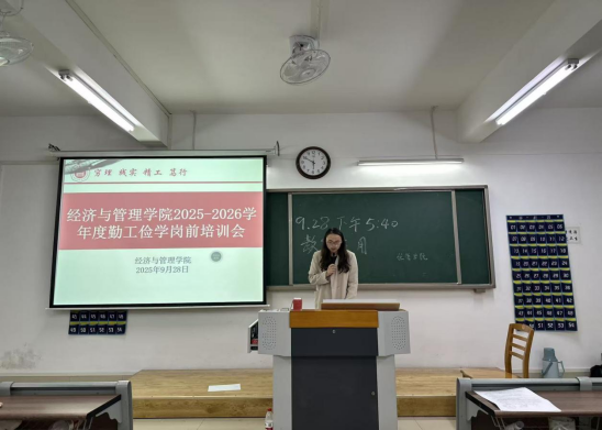 为规范勤工助学岗位管理,帮助学生更好地适应工作角色,经济与管理学院于9月28日在二教422召开2025-2026学年勤工助学岗前培训会,学院书记助理员禹辛、实验室主任、教学秘书李健、负责勤工助学工作的老师以及66名已录用学生共同参加,会议由院学生会文体部部长汪朱仝主持。
