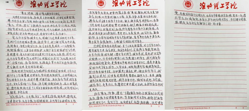 本次活动以自主学习与心得撰写相结合的形式有序推进,覆盖学院2025级所有新生班级,做到了新生全员参与、全程投入。活动伊始,由学生会牵头,辅导员班级群通知等多种渠道,向新生明确了活动的主题要求、学习内容和时间节点。活动要求全体新生自主研习《中华人民共和国宪法》《中华人民共和国刑法》《中华人民共和国治安管理处罚法》等重要法律法规,同时深入学习教育部及学校出台的各项规章制度,参照《学生手册》梳理校园纪律要求,做到知法、懂法、守法。
