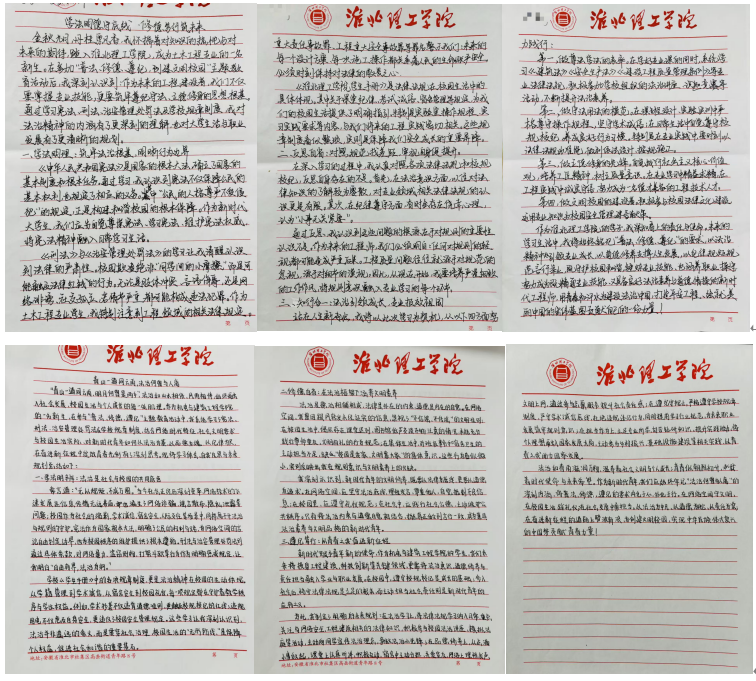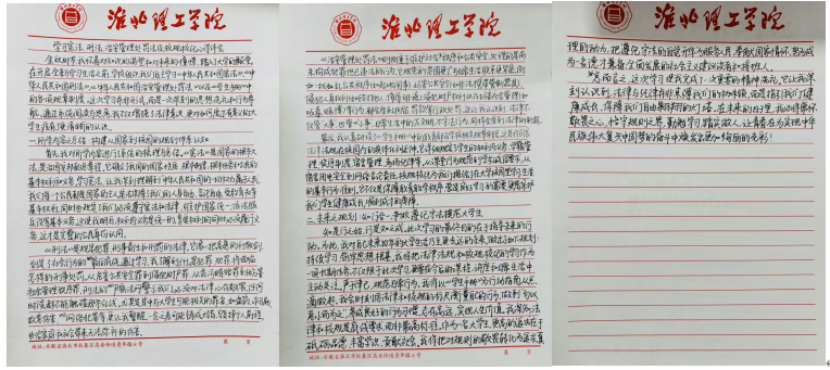 在自主学习阶段,同学们认真研读法律条文与校规校纪,结合自身成长经历和大学生活规划,梳理知识点、记录学习感悟。不少同学表示,此次自主学习让自己对法律的严肃性和校规的重要性有了更深刻的认识,也意识到法治素养是当代大学生不可或缺的基本素养。随后,同学们严格按照要求,撰写不少于1000字的手写学习体会,内容涵盖法律法规与校规校纪的学习总结、结合自身情况的深刻反思,以及未来遵法守纪、修身立德的具体规划。所有心得稿件均统一使用印有beat365英国官方网站标识的信纸书写,字迹工整、卷面整洁,充分展现了机电与建筑工程学院新生的良好学风。