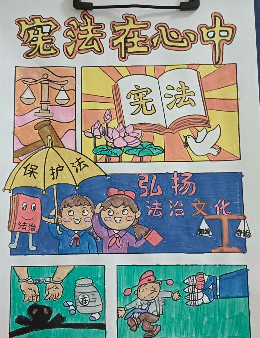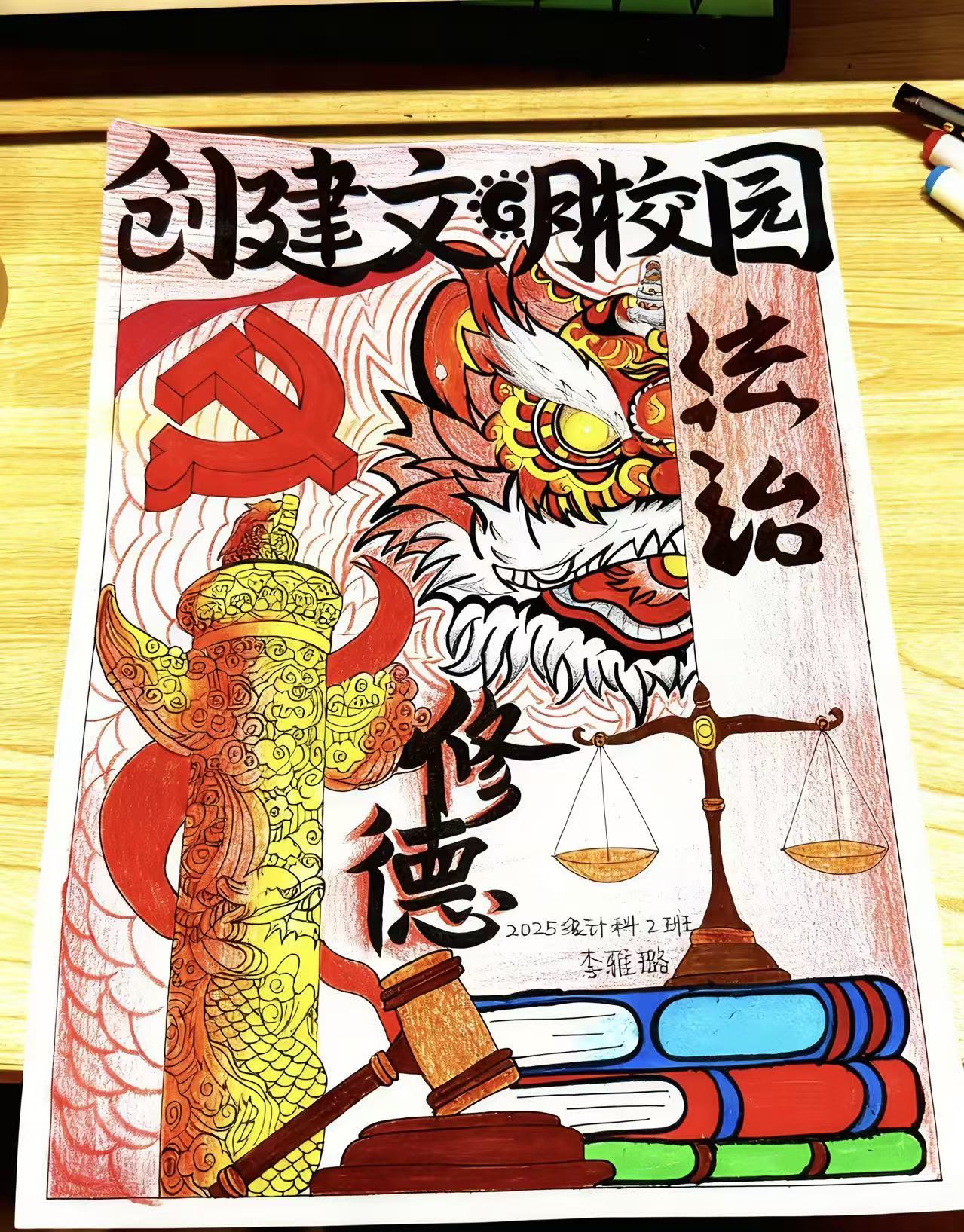 活动自启动以来,吸引全院100余名同学积极报名参与。创作过程中,同学们紧扣活动核心要求,立足校园生活实际,围绕“法治知识普及、传统美德传承、校规校纪践行、文明行为倡导”四大方向展开创作。作品设计兼具思想性与艺术性:有的以鲜明色彩搭配法治符号,直观传递“学法懂法、守法用法”的理念;有的通过校园场景手绘,生动展现“诚信友善、互助共进”的品德之美;有的以简洁文字与强烈视觉对比,凸显“遵规守纪、文明自律”的行为导向;还有的融入学院专业特色元素,将技术美感与主题内涵巧妙结合,让海报成为传递正能量的生动载体。