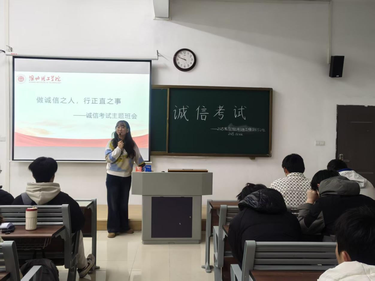 为进一步加强学风建设,严肃考纪考风,引导学生自觉树立诚信意识、端正考试态度,营造公平、公正、有序的考试环境,机电与建筑工程学院于2025年12月22日至25日,组织各年级于一号教学楼集中开展了“诚信考试”期末主题教育班会。本次班会由各班辅导员主持,学院全体学生参与。