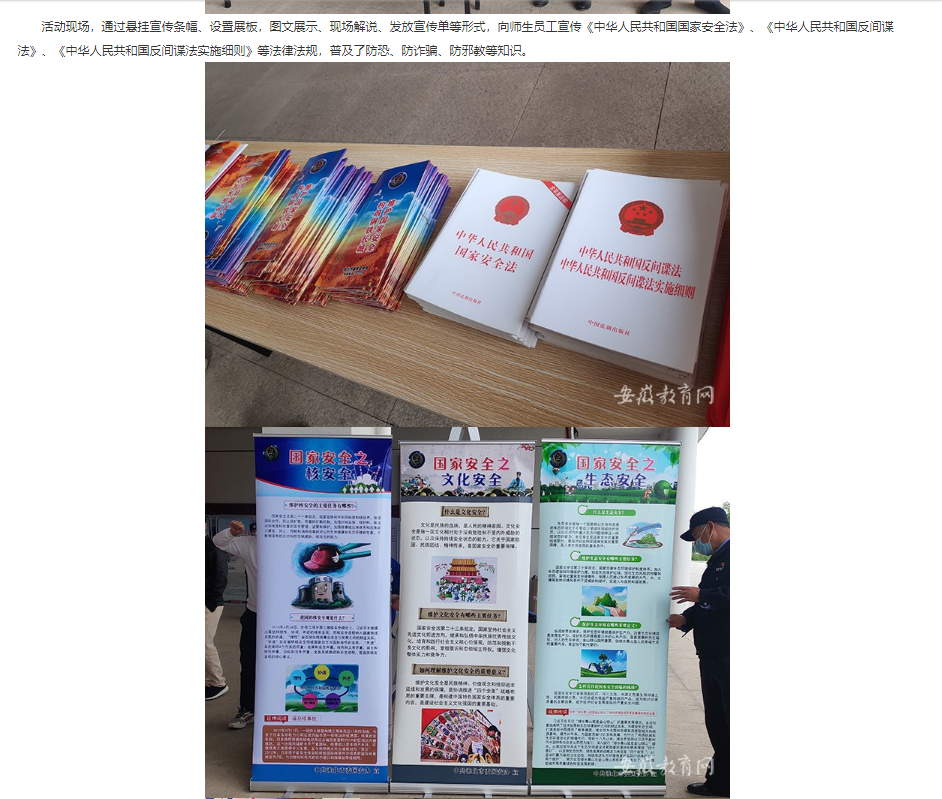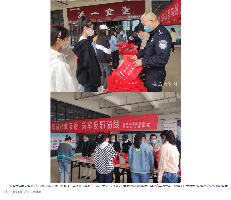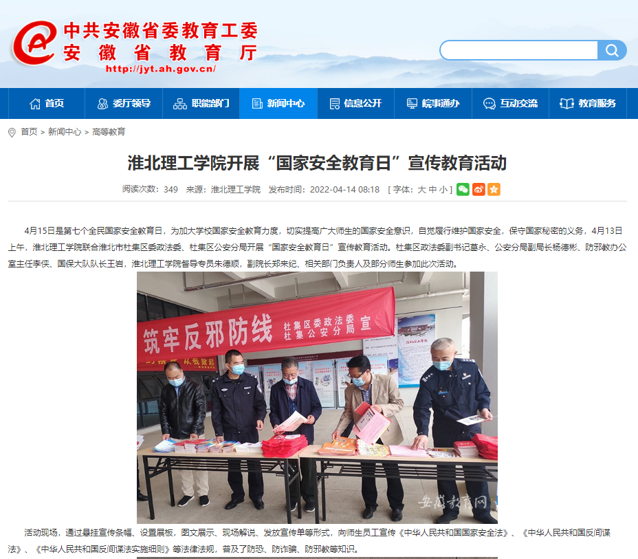 4月15日是第七个全民国家安全教育日,为加大学校国家安全教育力度,切实提高广大师生的国家安全意识,自觉履行维护国家安全,保守国家秘密的义务,4月13日上午,beat365英国官方网站联合淮北市杜集区委政法委、杜集区公安分局开展“国家安全教育日”宣传教育活动。安徽教育网在首页进行了报道。