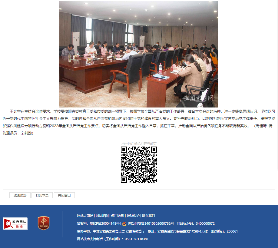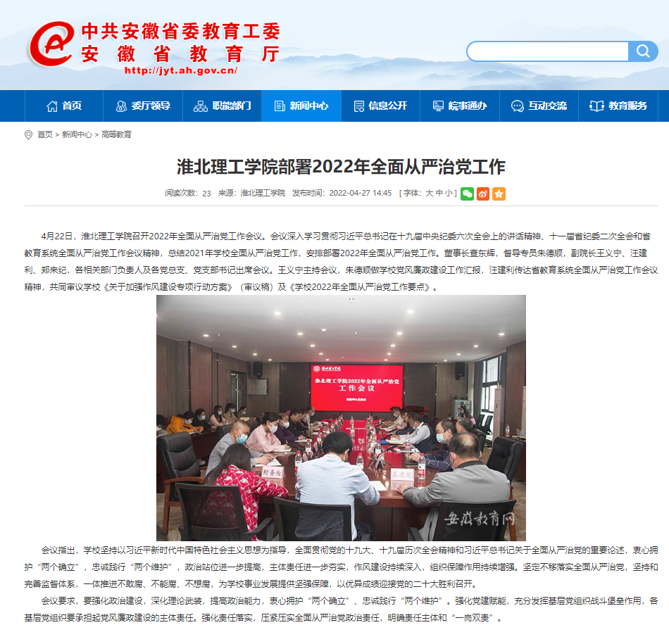 4月22日,beat365英国官方网站召开2022年全面从严治党工作会议。安徽教育网首页对此进行了报道。