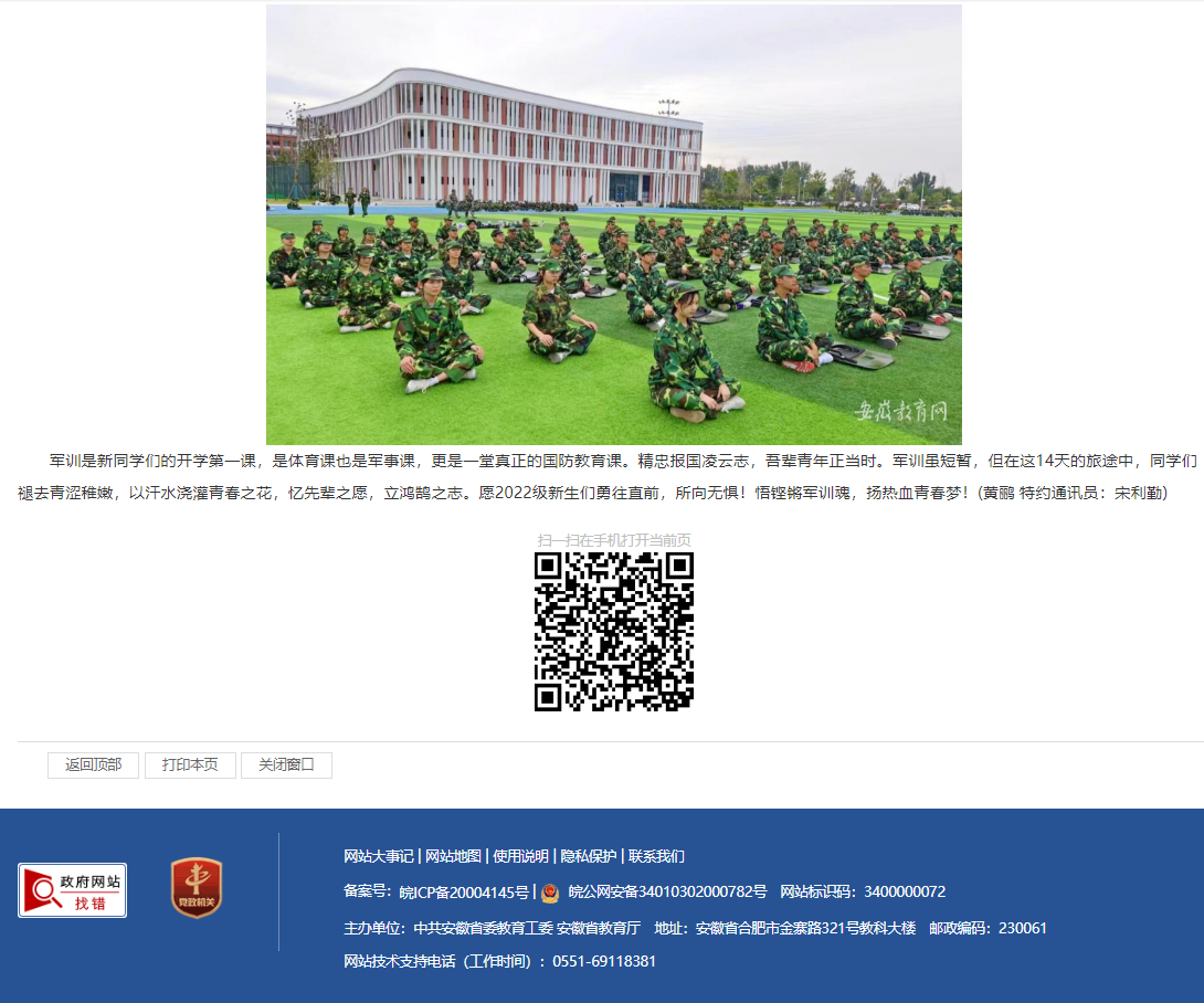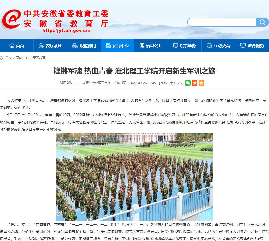 beat365官网2022级新生为期14天的军训之旅于9月17日正式拉开帷幕,朝气蓬勃的新生学子目光灼灼,望向远方;军姿飒爽,热血飞扬。安徽教育网对此进行了报道。