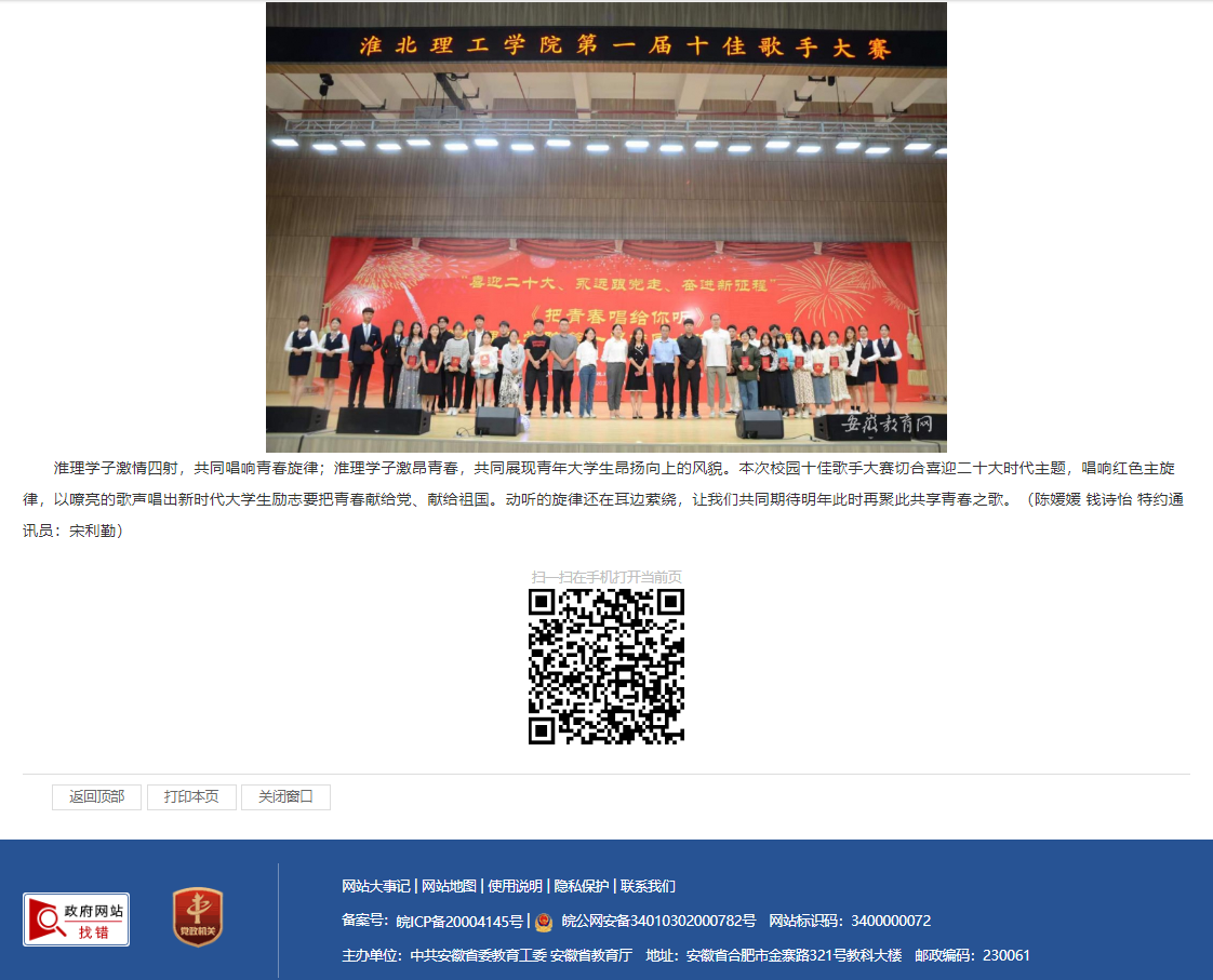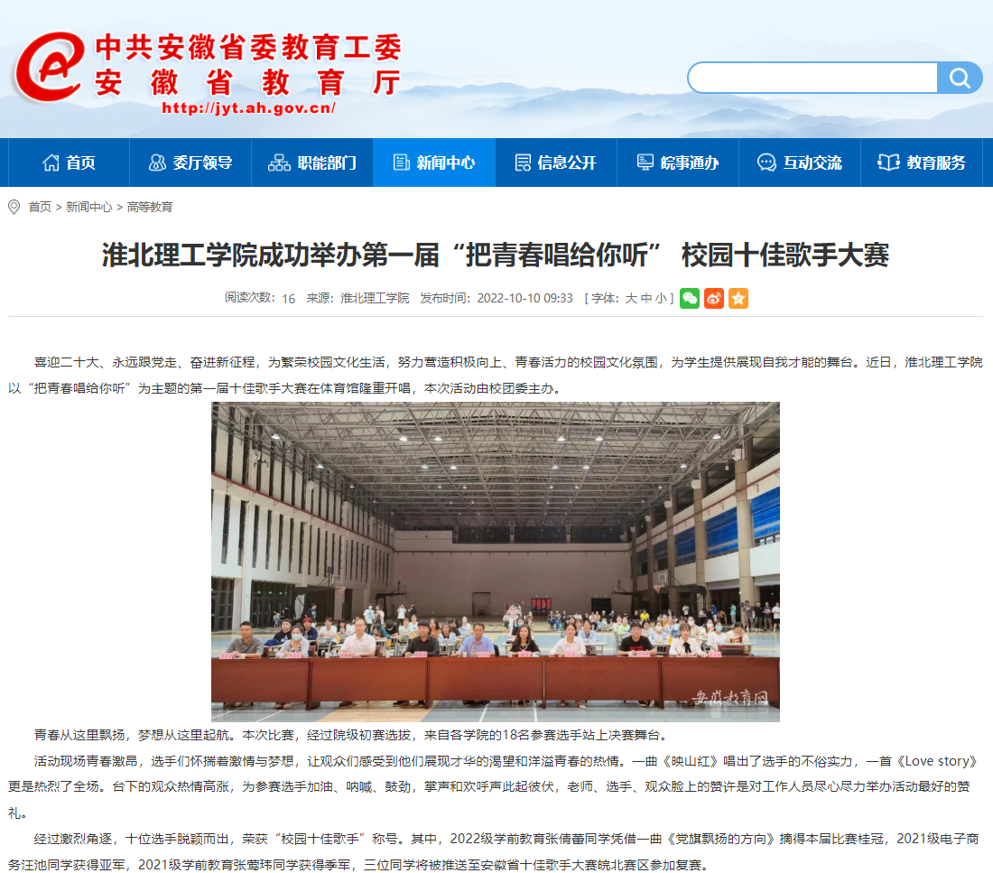 为繁荣校园文化生活,努力营造积极向上、青春活力的校园文化氛围,为学生提供展现自我才能的舞台。beat365英国官方网站以“把青春唱给你听”为主题的第一届十佳歌手大赛在体育馆隆重开唱。安徽教育网对此进行了报道。
