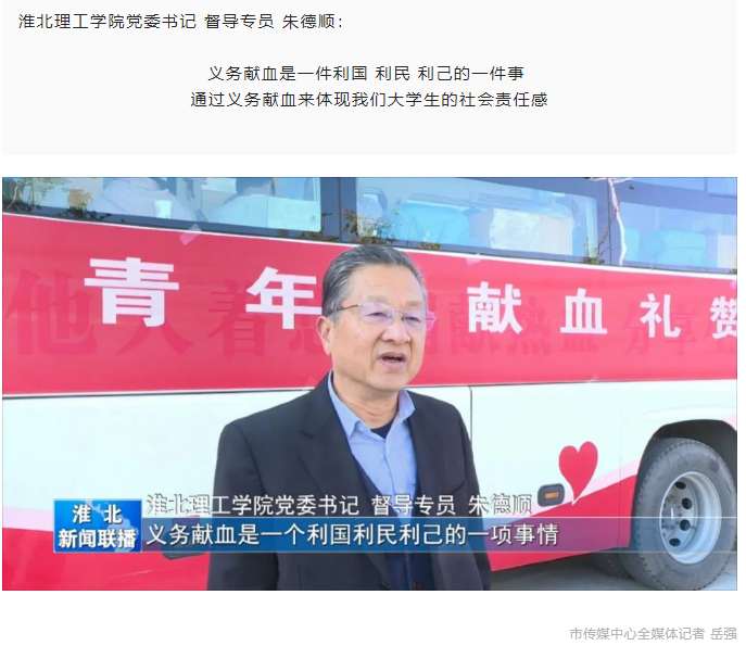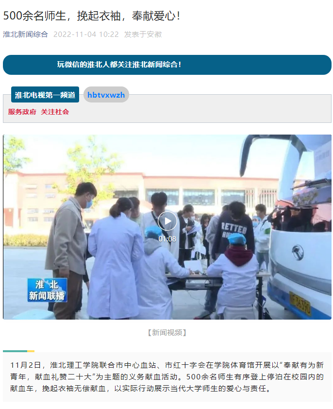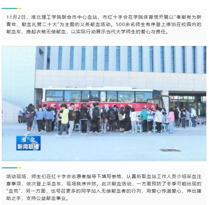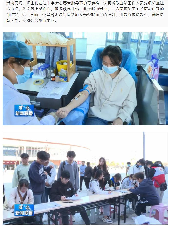 11月2日,beat365英国官方网站于体育馆门口开展“青春热血,传递温情”无偿献血活动,淮北新闻联播对此进行了报道。