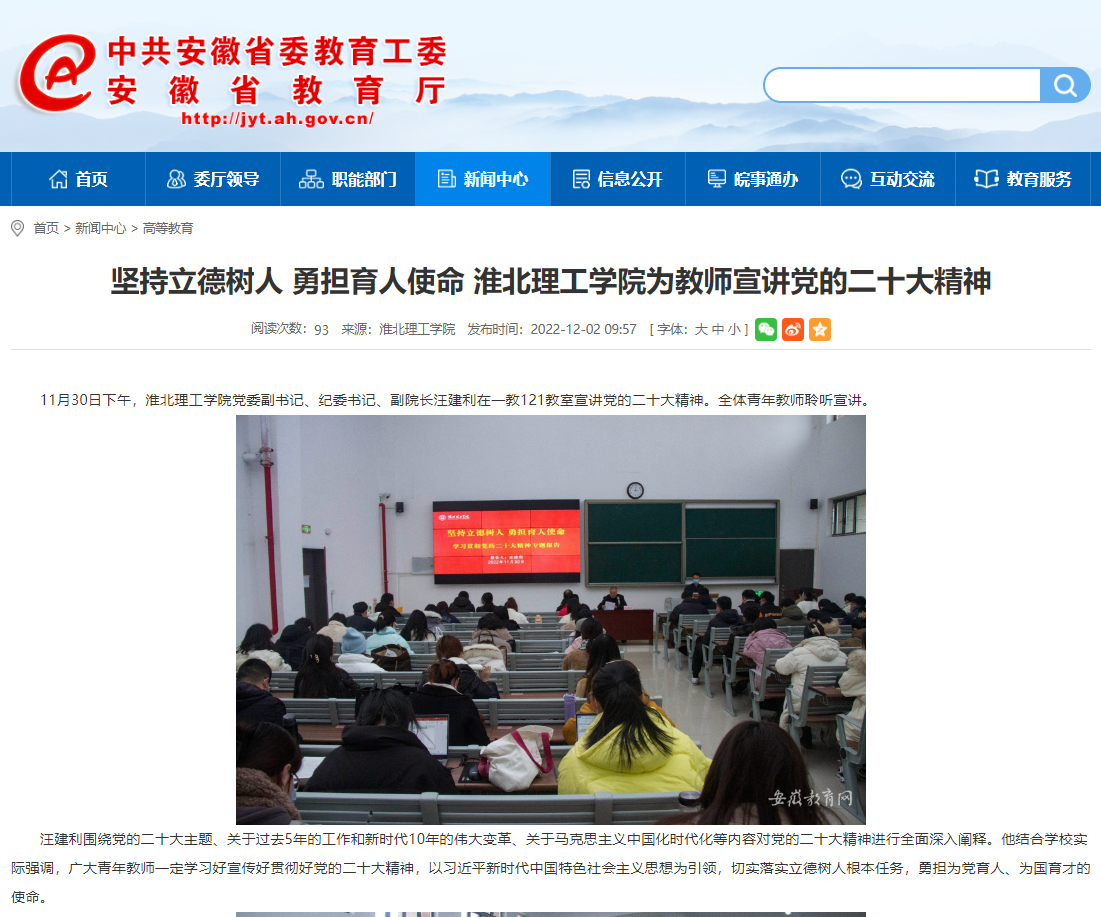 11月30日下午,beat365英国官方网站党委副书记、纪委书记、副院长汪建利在一教121教室宣讲党的二十大精神。全体青年教师聆听宣讲。安徽教育网对此进行了报道。