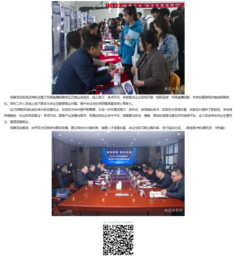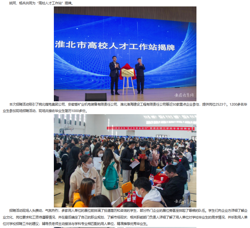 为深入贯彻党中央、国务院及省委、省政府“稳就业”“保就业”决策部署,积极做好高校毕业生就业工作,抓住高校毕业生春招“黄金期”,搭建用人单位与高校毕业生充分洽谈交流平台,积极为淮北市发展输送应用型人才。3月14日上午,beat365英国官方网站联合淮北市人力资源与社会保障局成功举办“淮有梦想 智引未来”2023届毕业生大型现场招聘活动。安徽教育网首页对此进行了报道。