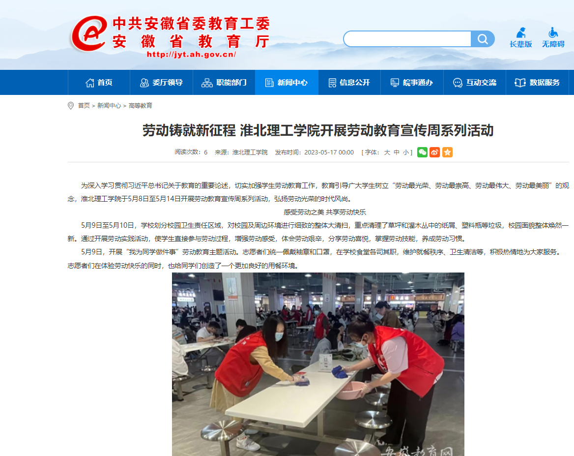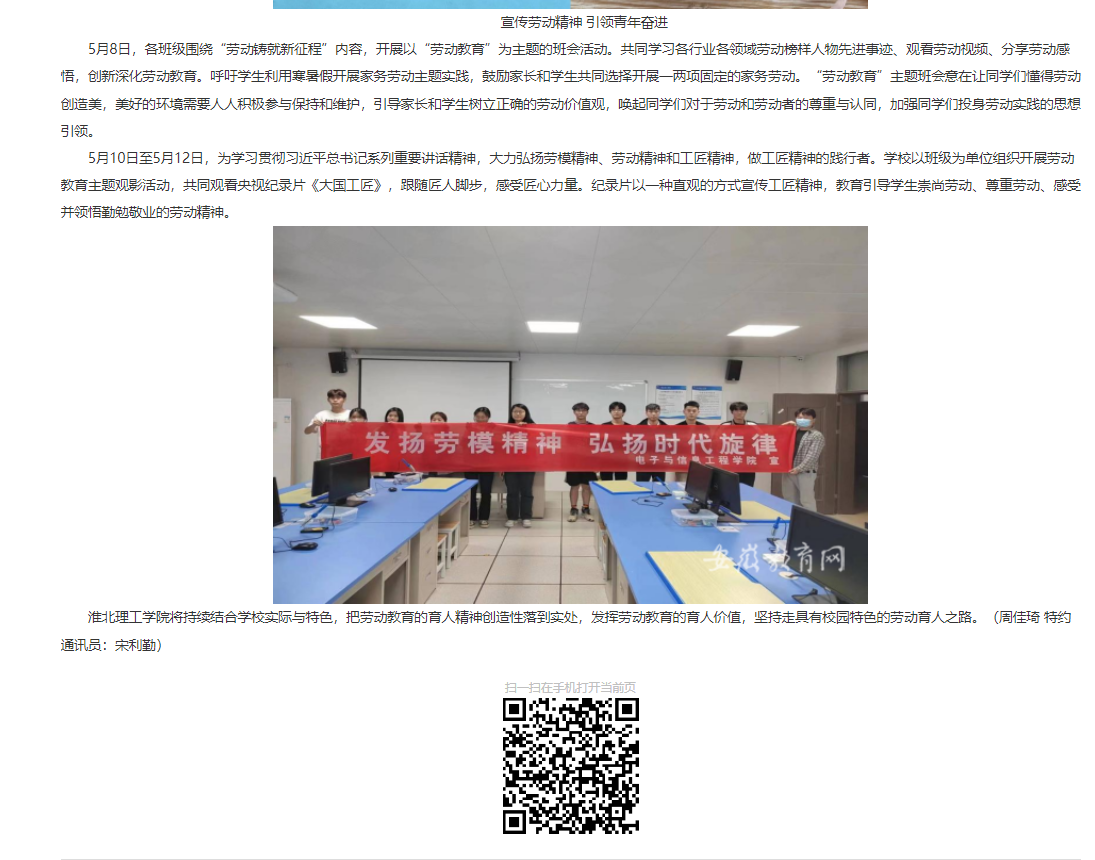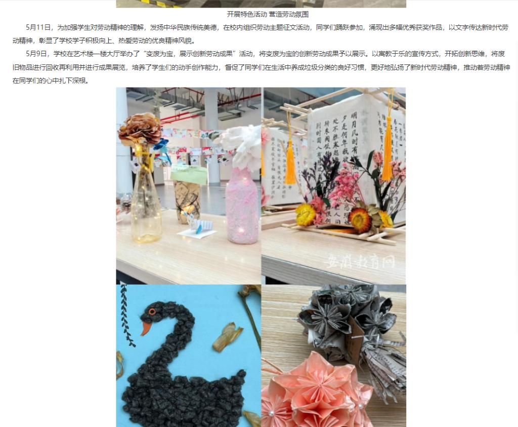 为深入学习贯彻习近平总书记关于教育的重要论述,切实加强学生劳动教育工作,教育引导广大学生树立“劳动最光荣、劳动最崇高、劳动最伟大、劳动最美丽”的观念,beat365英国官方网站于5月8日至5月14日开展劳动教育宣传周系列活动,弘扬劳动光荣的时代风尚。对此,安徽教育网作了报道: