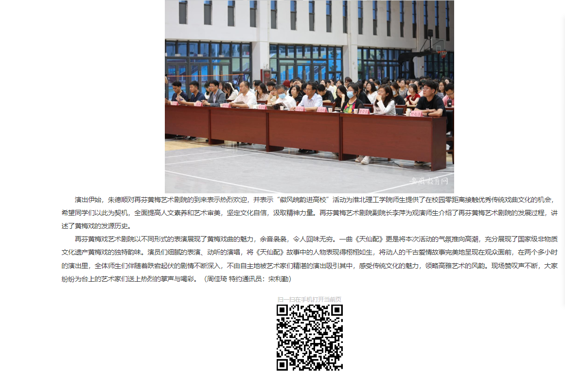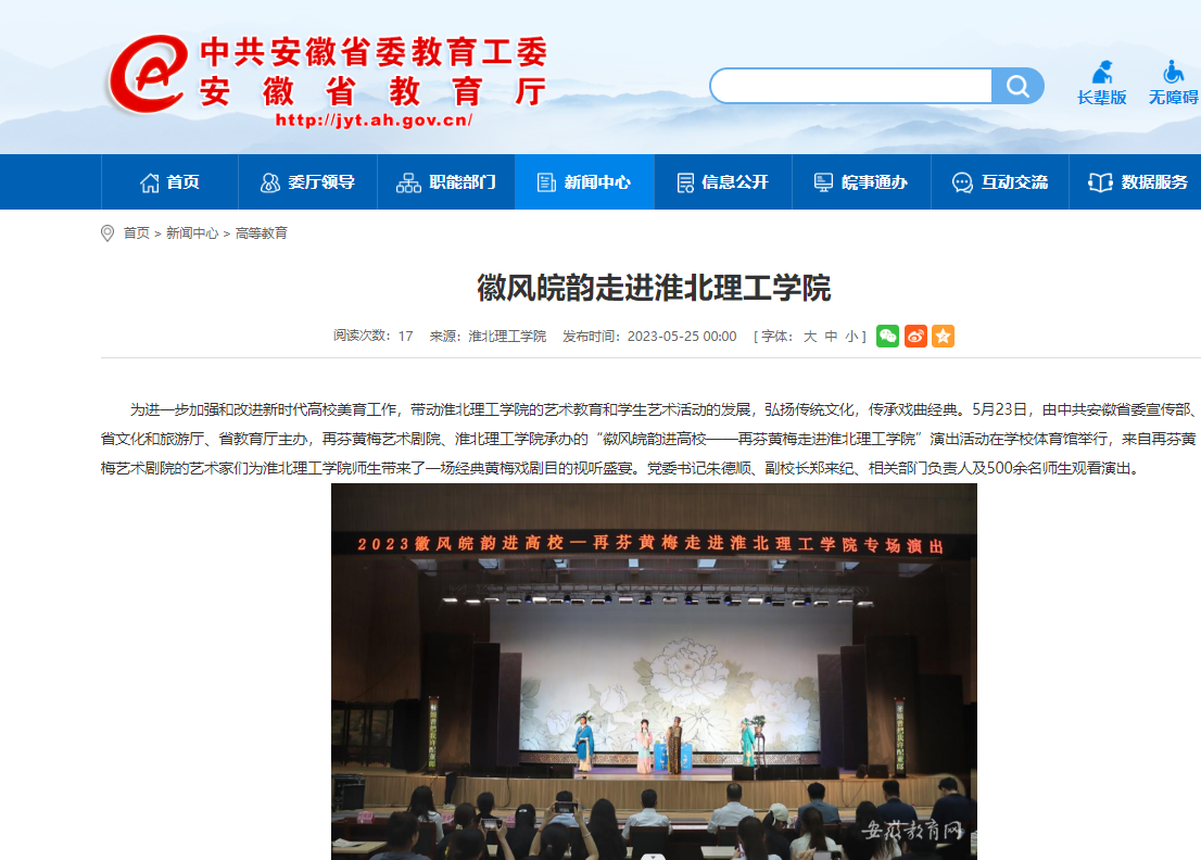 为进一步加强和改进新时代高校美育工作,带动beat365英国官方网站的艺术教育和学生艺术活动的发展,弘扬传统文化,传承戏曲经典。5月23日,由中共安徽省委宣传部、省文化和旅游厅、省教育厅主办,再芬黄梅艺术剧院、beat365英国官方网站承办的“徽风皖韵进高校——再芬黄梅走进beat365英国官方网站”演出活动在学校体育馆举行,来自再芬黄梅艺术剧院的艺术家们为beat365英国官方网站师生带来了一场经典黄梅戏剧目的视听盛宴。党委书记朱德顺、副校长郑来纪、相关部门负责人及500余名师生观看演出。对此,安徽教育网进行了报道: