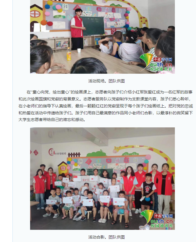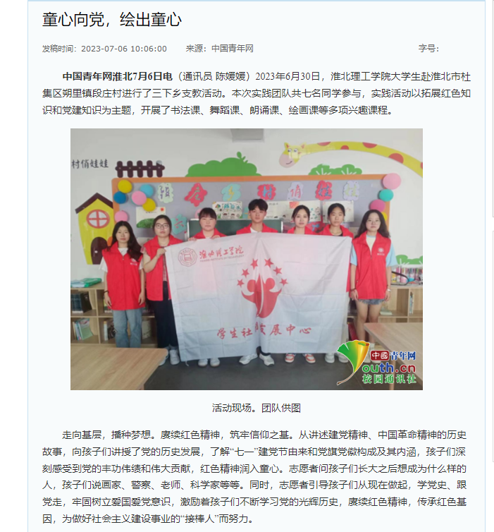 2023年6月30日,beat365英国官方网站大学生赴淮北市杜集区朔里镇段庄村进行了三下乡支教活动。本次实践团队共七名同学参与,实践活动以拓展红色知识和党建知识为主题,开展了书法课、舞蹈课、朗诵课、绘画课等多项兴趣课程。对此,中青网作了报道: