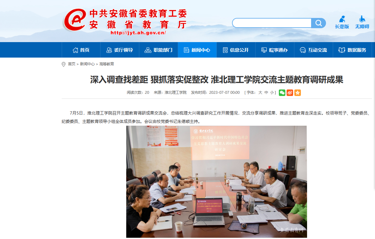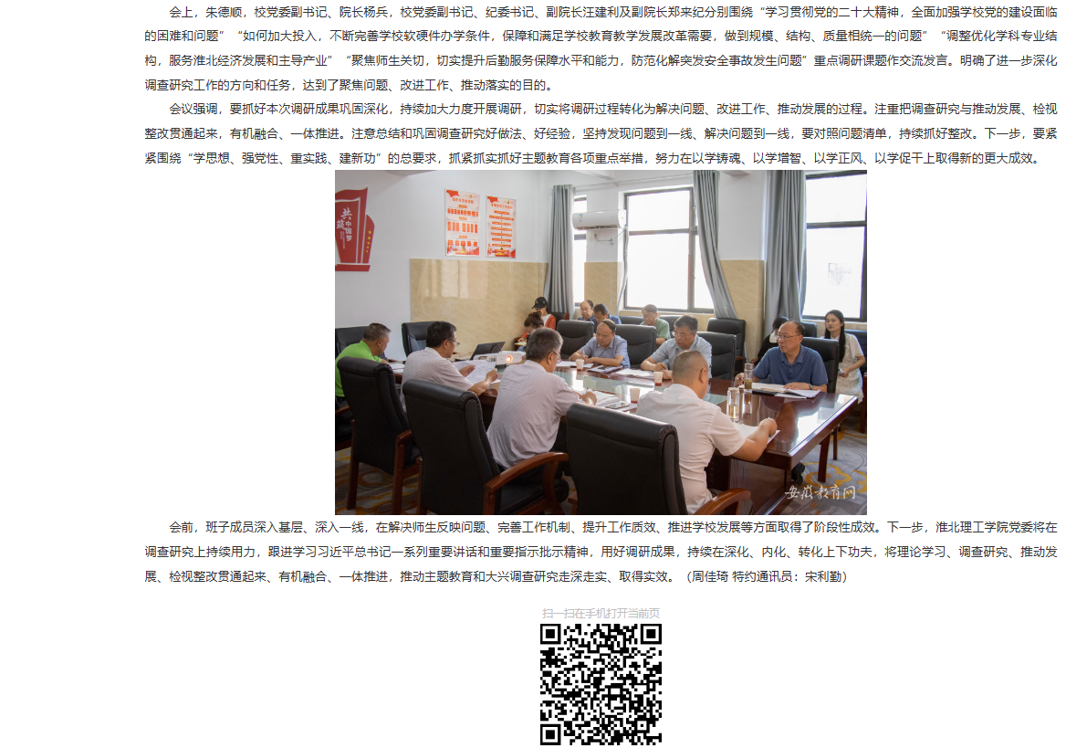 7月5日,beat365英国官方网站召开主题教育调研成果交流会,总结梳理大兴调查研究工作开展情况,交流分享调研成果,推进主题教育走深走实。校领导班子、党委委员、纪委委员、主题教育领导小组全体成员参加。会议由校党委书记朱德顺主持。对此,安徽教育网进行了报道: