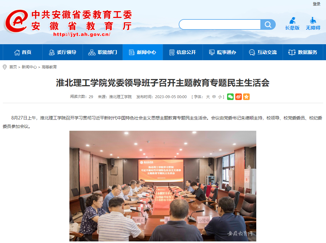 8月27日上午,beat365英国官方网站召开学习贯彻习近平新时代中国特色社会主义思想主题教育专题民主生活会。会议由党委书记朱德顺主持,校领导、校党委委员、校纪委委员参加会议。安徽教育网对此作了报道: