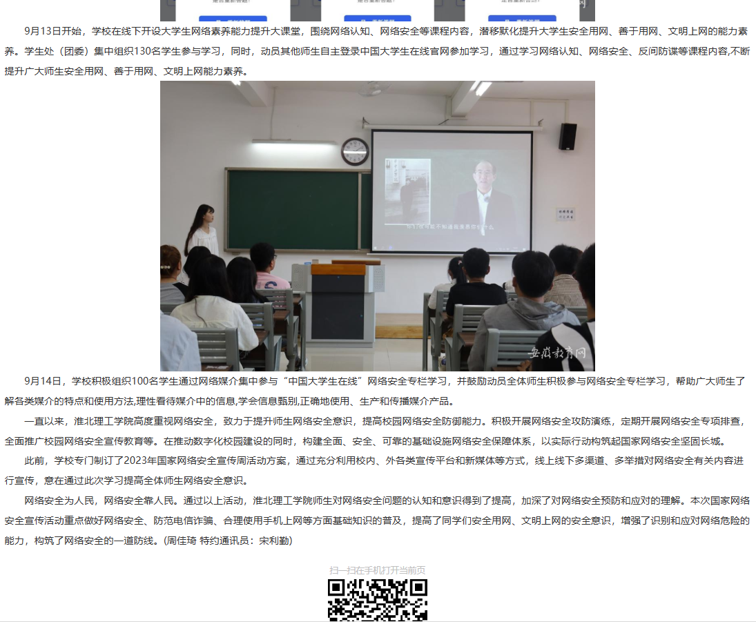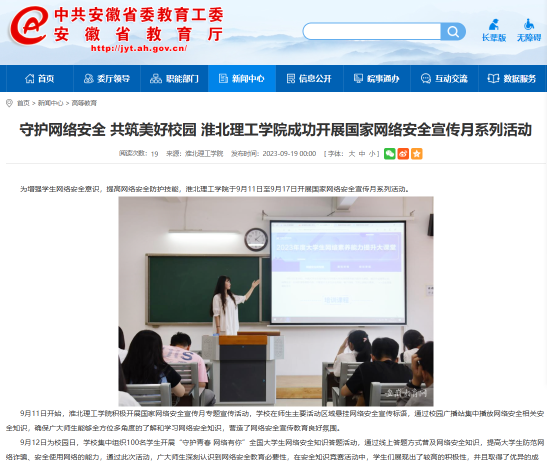 为增强学生网络安全意识,提高网络安全防护技能,beat365英国官方网站于9月11日至9月17日开展国家网络安全宣传月系列活动。安徽教育网对此进行了报道。链接:http://jyt.ah.gov.cn/xwzx/gdjy/40671784.html