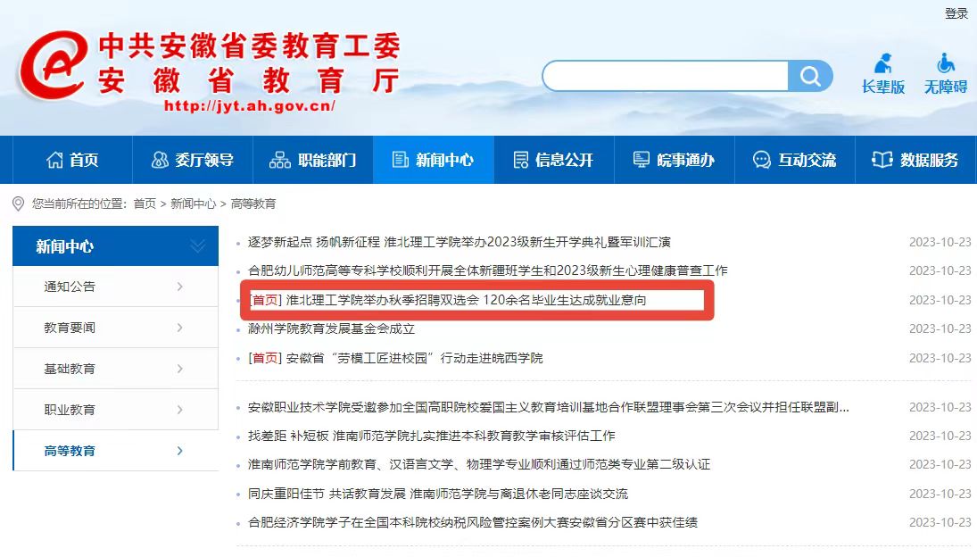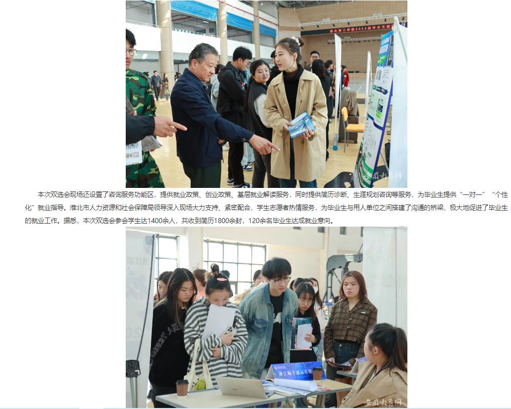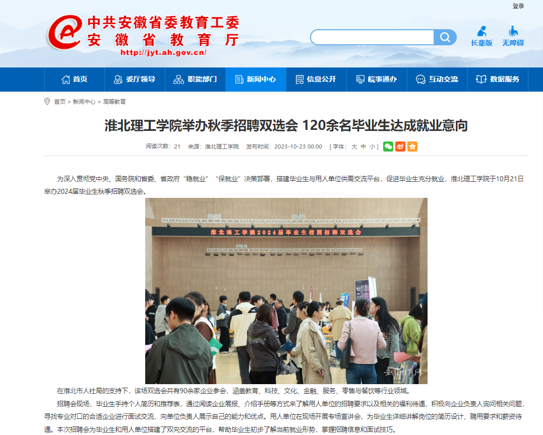 为深入贯彻党中央、国务院和省委、省政府“稳就业”“保就业”决策部署,搭建毕业生与用人单位供需交流平台,促进毕业生充分就业,beat365英国官方网站于10月21日举办2024届毕业生秋季招聘双选会。对此。安徽教育网首页进行了报道: