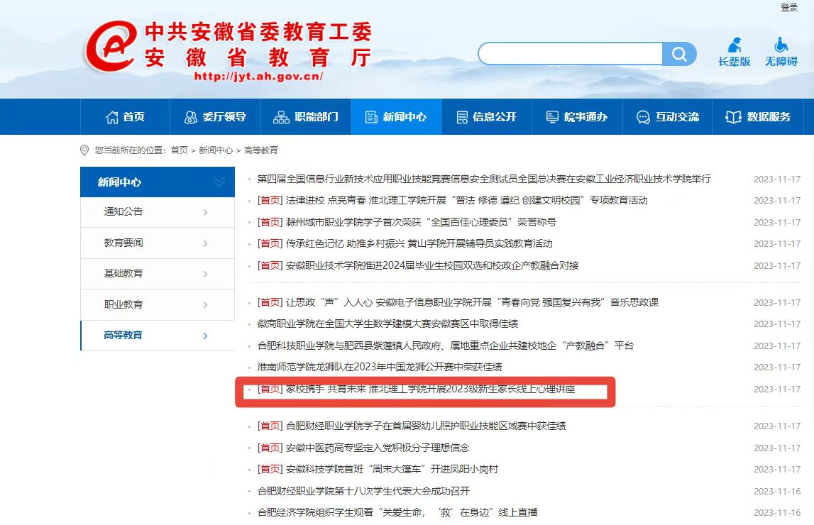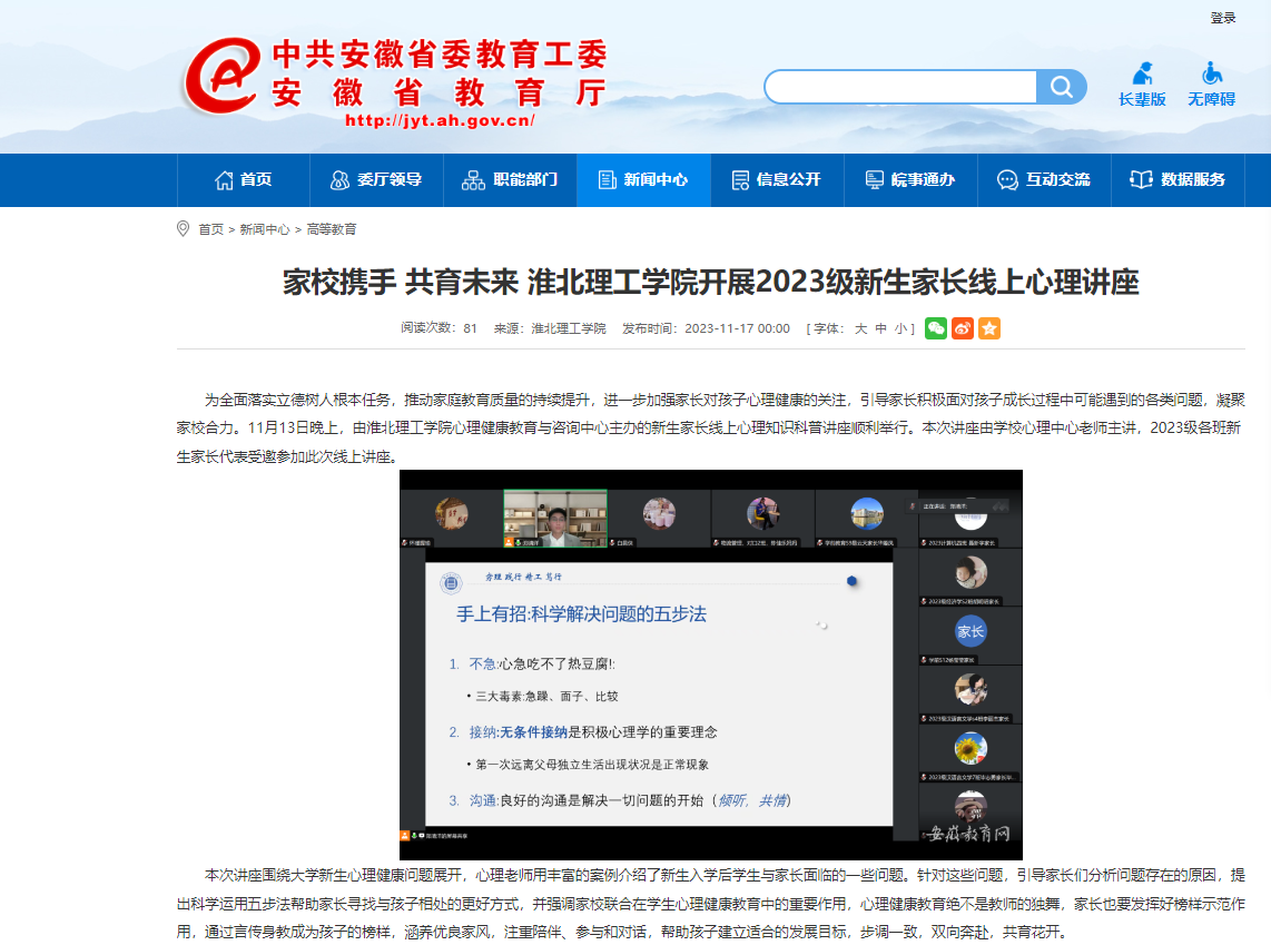 为全面落实立德树人根本任务,推动家庭教育质量的持续提升,进一步加强家长对孩子心理健康的关注,引导家长积极面对孩子成长过程中可能遇到的各类问题,凝聚家校合力。11月13日晚上,由beat365英国官方网站心理健康教育与咨询中心主办的新生家长线上心理知识科普讲座顺利举行。对此,安徽教育网进行了报道: