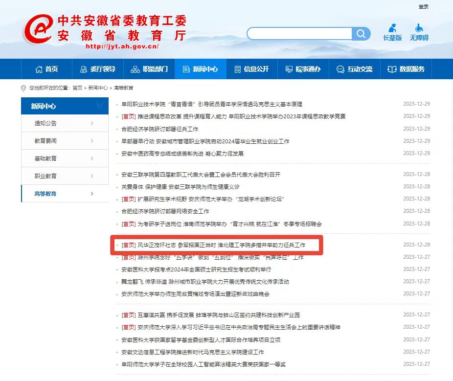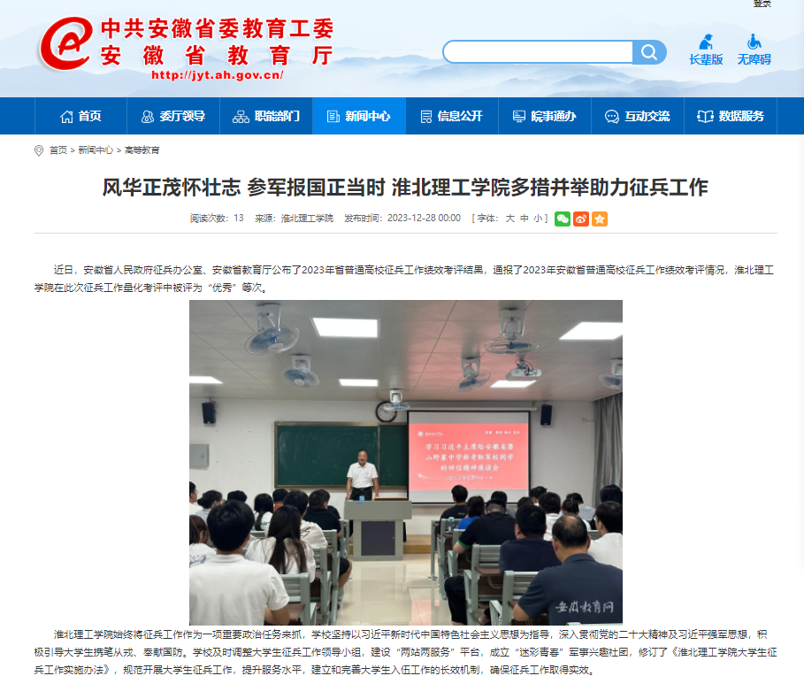 近日,安徽省人民政府征兵办公室、安徽省教育厅公布了2023年省普通高校征兵工作绩效考评结果,通报了2023年安徽省普通高校征兵工作绩效考评情况,beat365英国官方网站在此次征兵工作量化考评中被评为“优秀”等次。对此,安徽教育网进行了报道:
