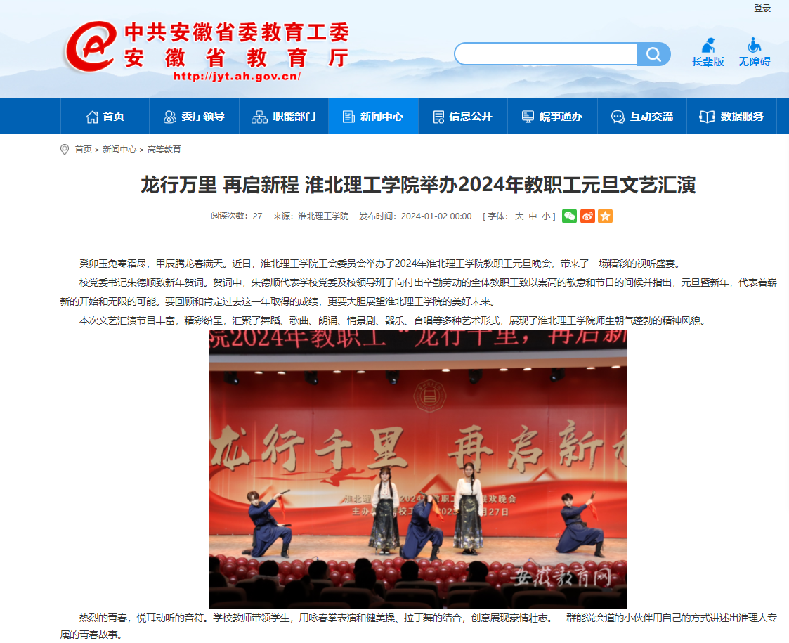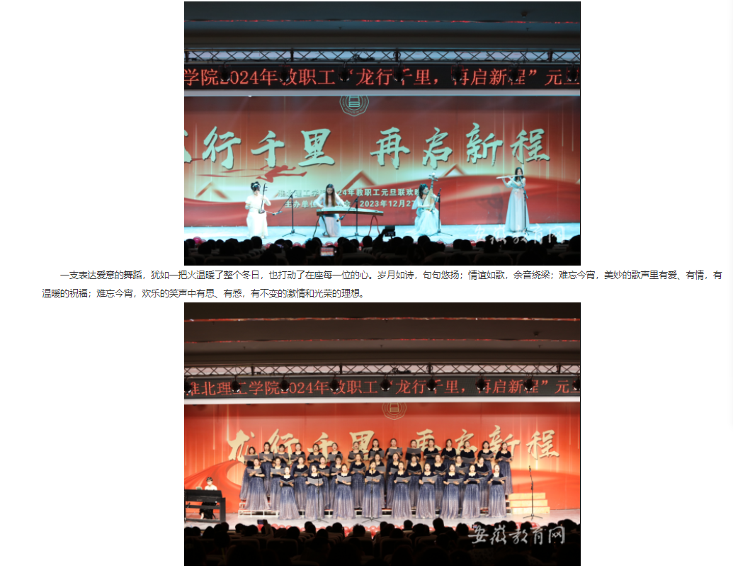 癸卯玉兔寒霜尽,甲辰腾龙春满天。近日,beat365英国官方网站工会委员会举办了2024年beat365英国官方网站教职工元旦晚会,带来了一场精彩的视听盛宴。对此,安徽教育网进行了报道: