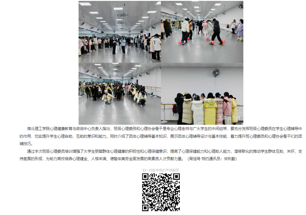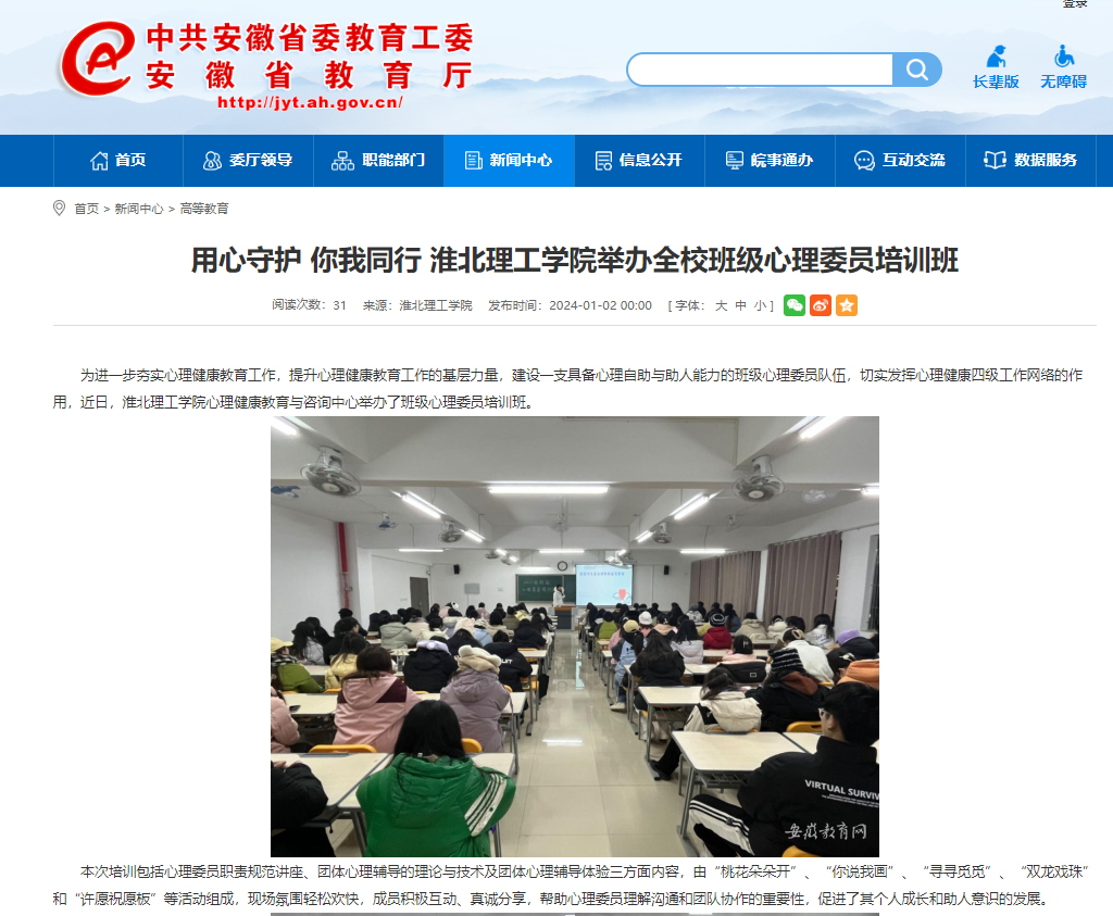 为进一步夯实心理健康教育工作,提升心理健康教育工作的基层力量,建设一支具备心理自助与助人能力的班级心理委员队伍,切实发挥心理健康四级工作网络的作用,近日,beat365英国官方网站心理健康教育与咨询中心举办了班级心理委员培训班。对此,安徽教育网进行了报道:
