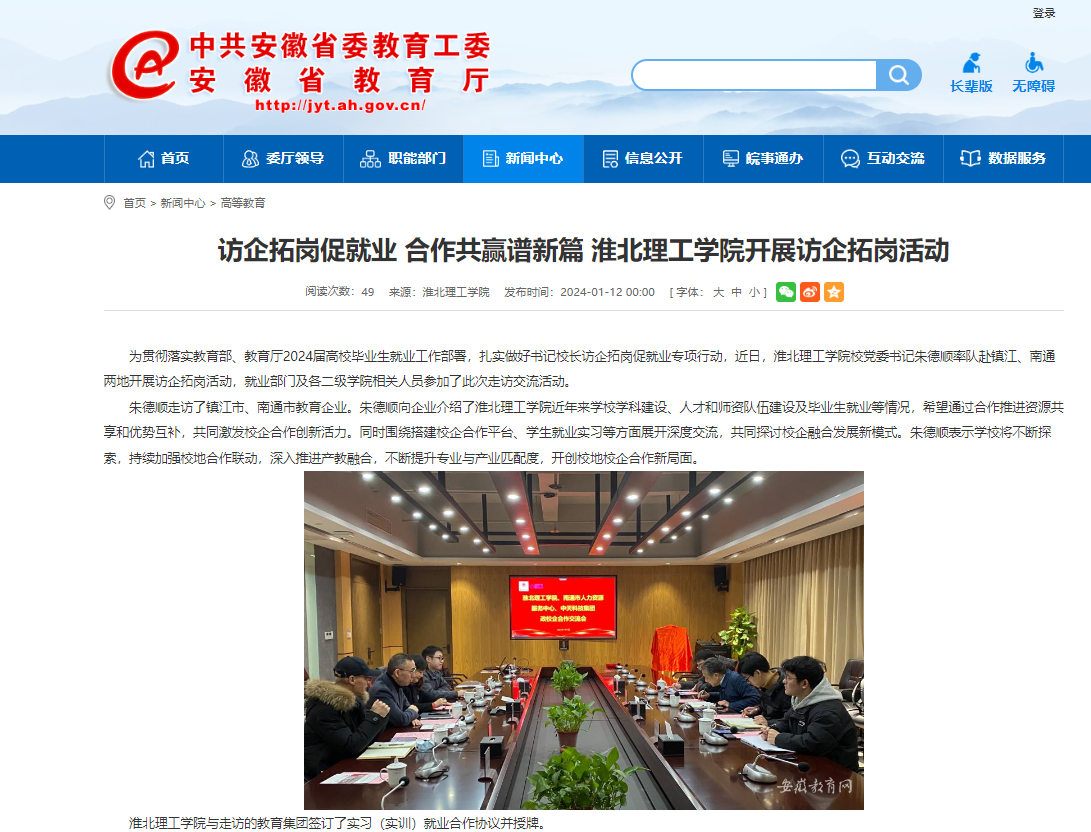 为贯彻落实教育部、教育厅2024届高校毕业生就业工作部署,扎实做好书记校长访企拓岗促就业专项行动,近日,beat365英国官方网站校党委书记朱德顺率队赴镇江、南通两地开展访企拓岗活动,就业部门及各二级学院相关人员参加了此次走访交流活动。对此,安徽教育网进行了报道: