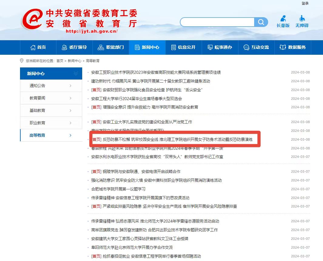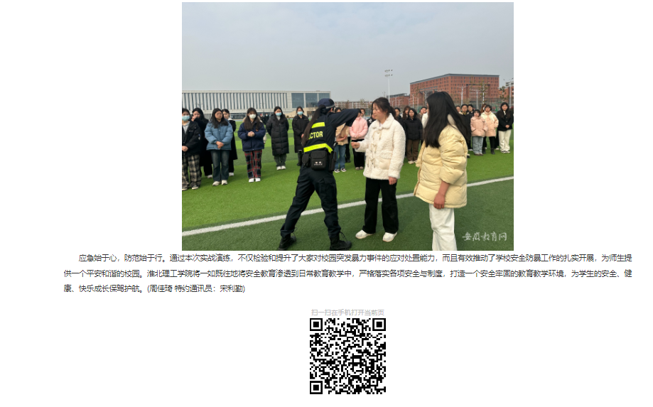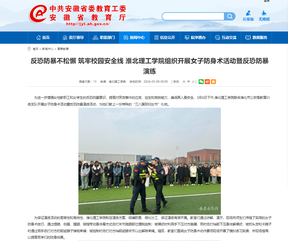 为进一步增强女性教职工和女学生的反恐防暴意识,提高对突发事件的应变、逃生和自救能力,确保其人身安全,3月6日下午,beat365英国官方网站联合淮北市公安局教育训练支队开展女子防身术活动暨反恐防暴演练活动,为她们献上一份特殊的“三八国际妇女节”礼物。对此,安徽教育网进行了报道:
