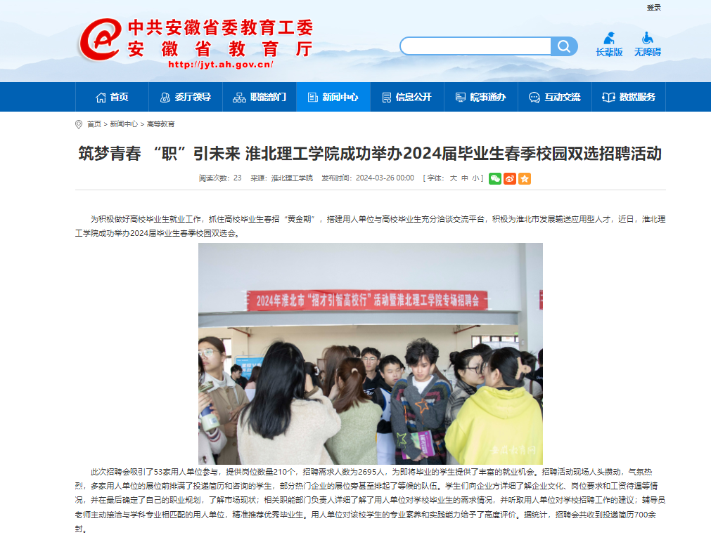 为积极做好高校毕业生就业工作,抓住高校毕业生春招“黄金期”,搭建用人单位与高校毕业生充分洽谈交流平台,积极为淮北市发展输送应用型人才,近日,beat365英国官方网站成功举办2024届毕业生春季校园双选会。对此,安徽教育网进行了报道:
