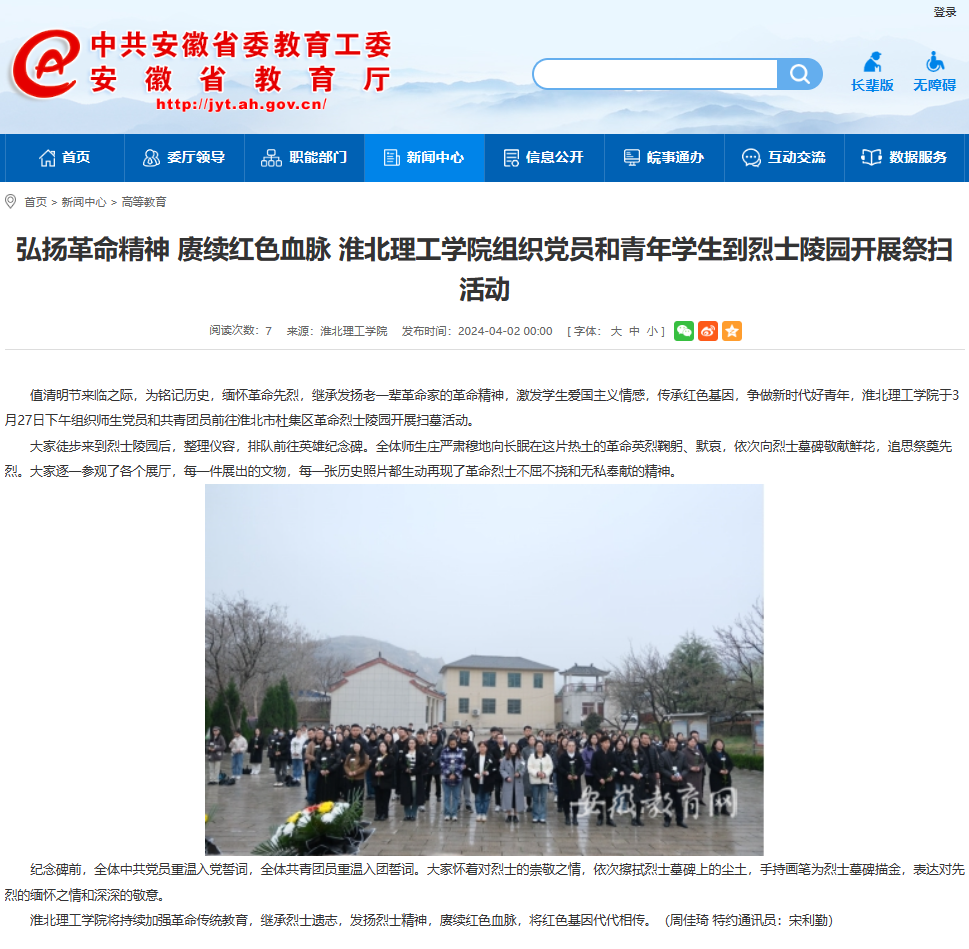 值清明节来临之际,为铭记历史,缅怀革命先烈,继承发扬老一辈革命家的革命精神,激发学生爱国主义情感,传承红色基因,争做新时代好青年,beat365英国官方网站于3月27日下午组织师生党员和共青团员前往淮北市杜集区革命烈士陵园开展扫墓活动。安徽教育网对此进行了报道。
