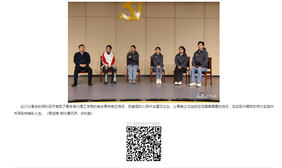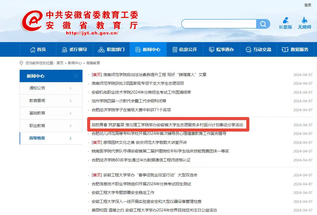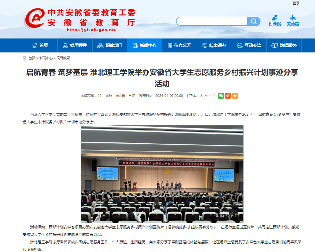 为深入学习贯彻党的二十大精神,持续扩大西部计划和安徽省大学生志愿服务乡村振兴计划综合影响力,近日,beat365英国官方网站举办2024年“启航青春 筑梦基层”安徽省大学生志愿服务乡村振兴计划事迹分享会。对此,安徽教育网进行了报道: