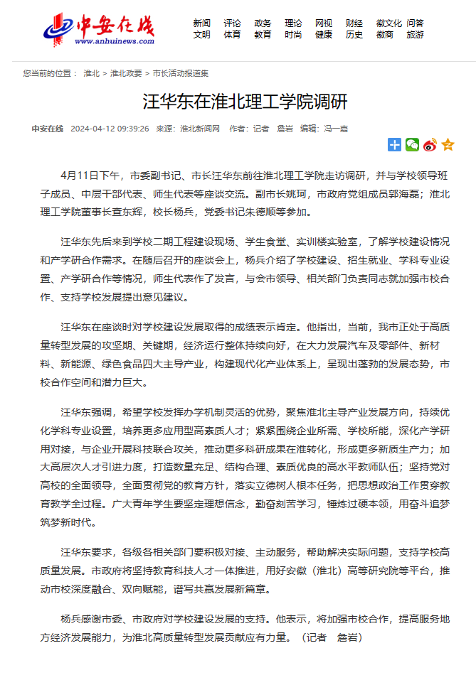 4月11日下午,市委副书记、市长汪华东前往beat365英国官方网站走访调研,并与学校领导班子成员、中层干部代表、师生代表等座谈交流。中安在线对此进行了报道。