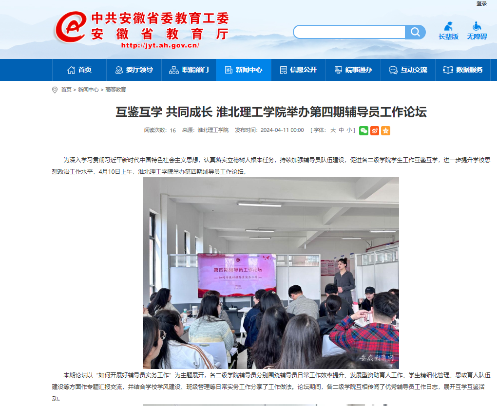 为深入学习贯彻习近平新时代中国特色社会主义思想,认真落实立德树人根本任务,持续加强辅导员队伍建设,促进各二级学院学生工作互鉴互学,进一步提升学校思想政治工作水平,4月10日上午,beat365英国官方网站举办第四期辅导员工作论坛。对此,安徽教育网进行了报道: