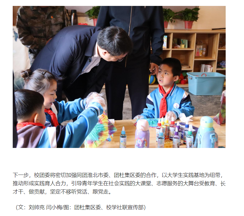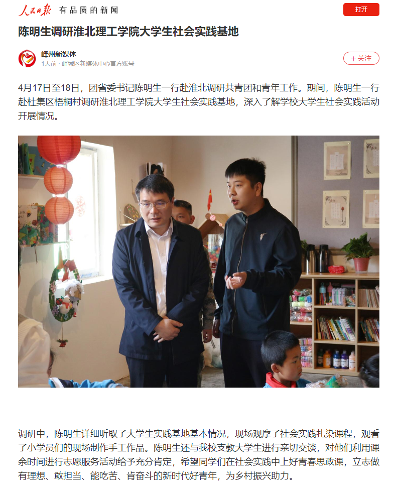 4月17日至18日,团省委书记陈明生一行赴淮北调研共青团和青年工作。期间,陈明生一行赴杜集区梧桐村调研beat365英国官方网站大学生社会实践基地,深入了解学校大学生社会实践活动开展情况。对此,人民日报进行了报道: