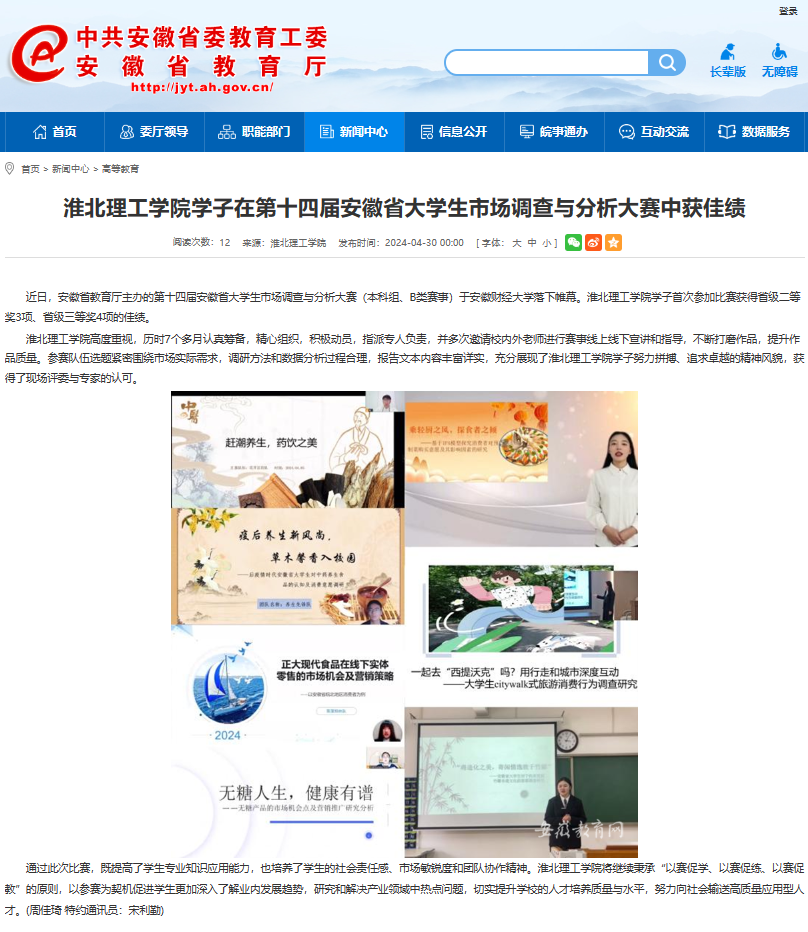 近日,安徽省教育厅主办的第十四届安徽省大学生市场调查与分析大赛(本科组、B类赛事)于安徽财经大学落下帷幕。beat365英国官方网站学子首次参加比赛获得省级二等奖3项、省级三等奖4项的佳绩。安徽教育网对此进行了报道。