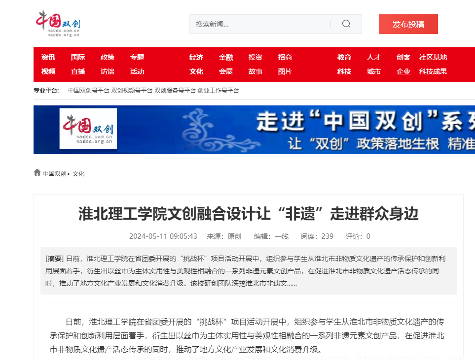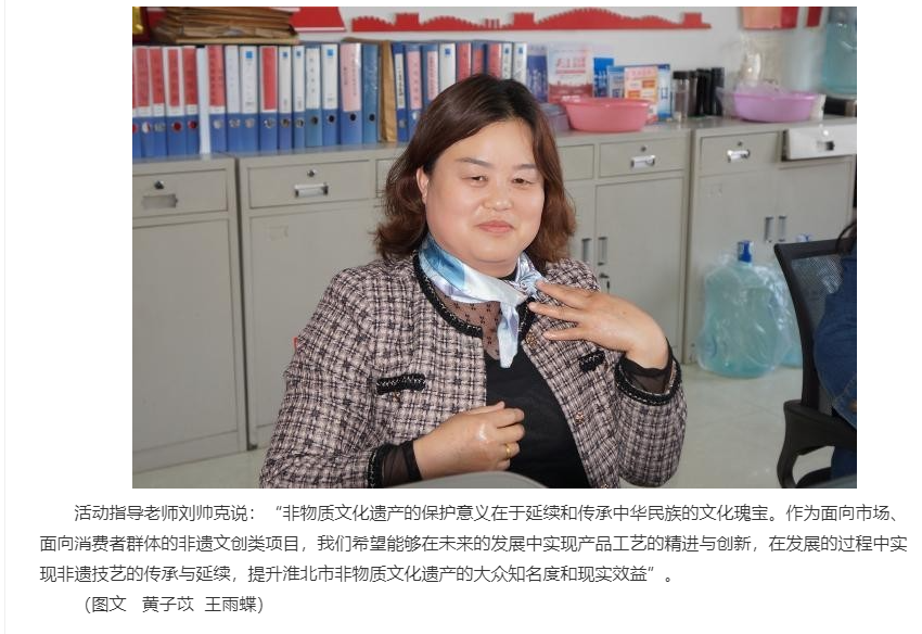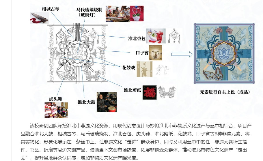 日前,beat365英国官方网站在省团委开展的“挑战杯”项目活动开展中,组织参与学生从淮北市非物质文化遗产的传承保护和创新利用层面着手,衍生出以丝巾为主体实用性与美观性相融合的一系列非遗元素文创产品,在促进淮北市非物质文化遗产活态传承的同时,推动了地方文化产业发展和文化消费升级。对此,中国双创网进行了报道: