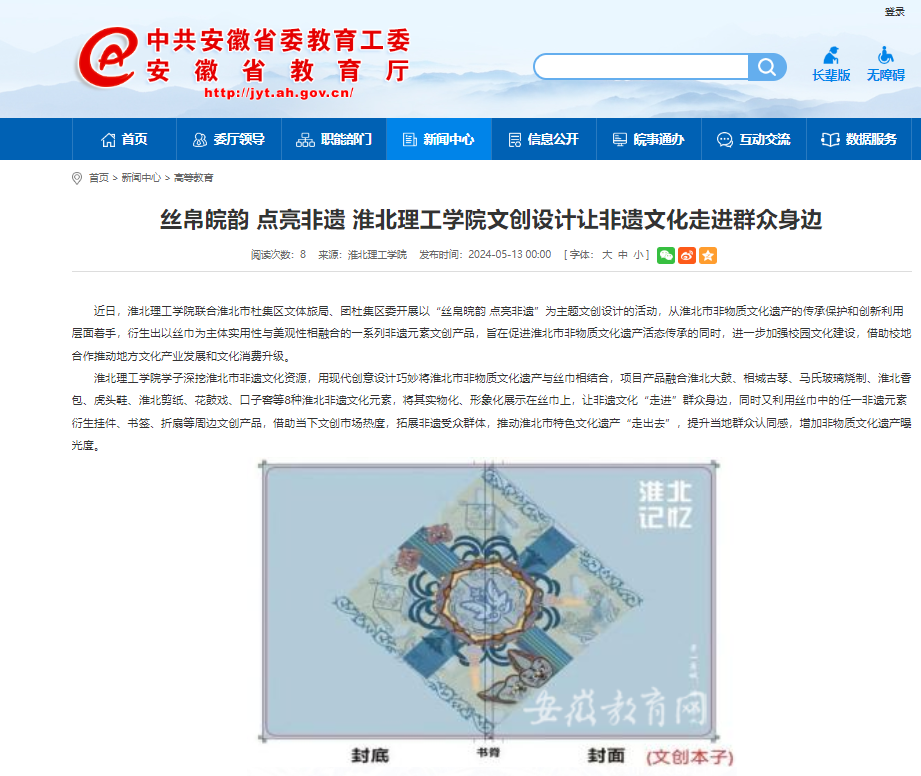 近日,beat365英国官方网站联合淮北市杜集区文体旅局、团杜集区委开展以“丝帛皖韵 点亮非遗”为主题文创设计的活动,从淮北市非物质文化遗产的传承保护和创新利用层面着手,衍生出以丝巾为主体实用性与美观性相融合的一系列非遗元素文创产品,旨在促进淮北市非物质文化遗产活态传承的同时,进一步加强校园文化建设,借助校地合作推动地方文化产业发展和文化消费升级。对此,安徽教育网进行了报道: