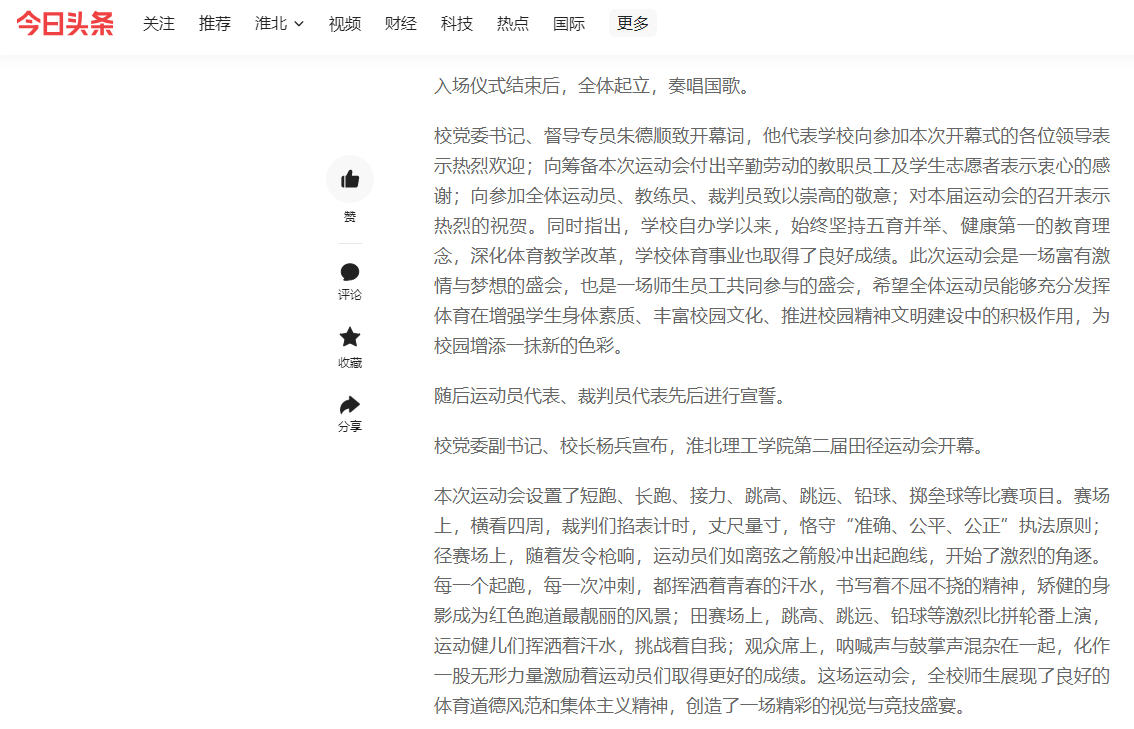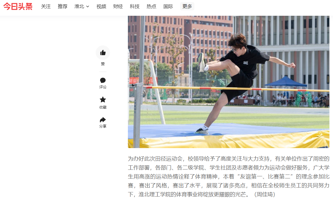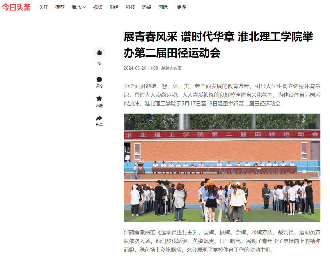 为全面贯彻德、智、体、美、劳全面发展的教育方针,引导大学生树立终身体育意识,营造人人崇尚运动、人人喜爱锻炼的良好校园体育文化氛围,为建设体育强国添能加油,beat365英国官方网站于5月17日至18日隆重举行第二届田径运动会。对此,今日头条进行了报道: